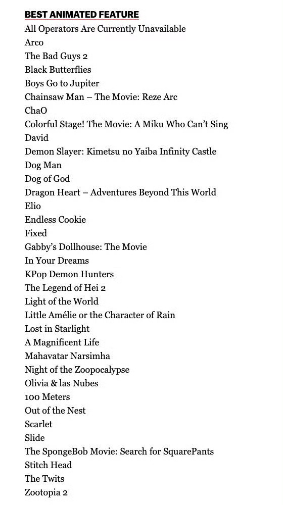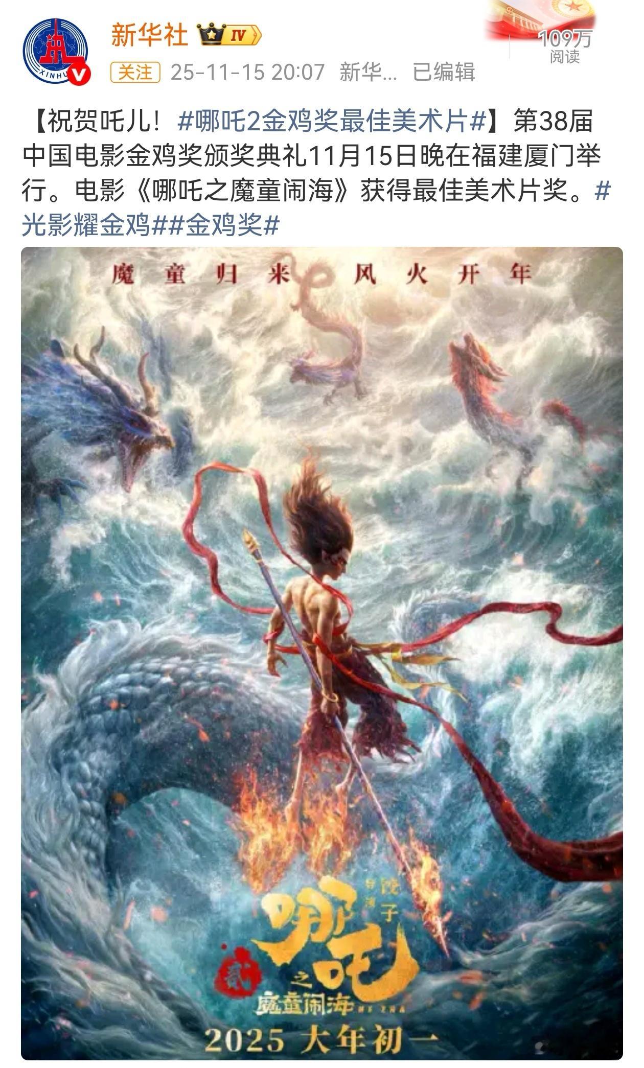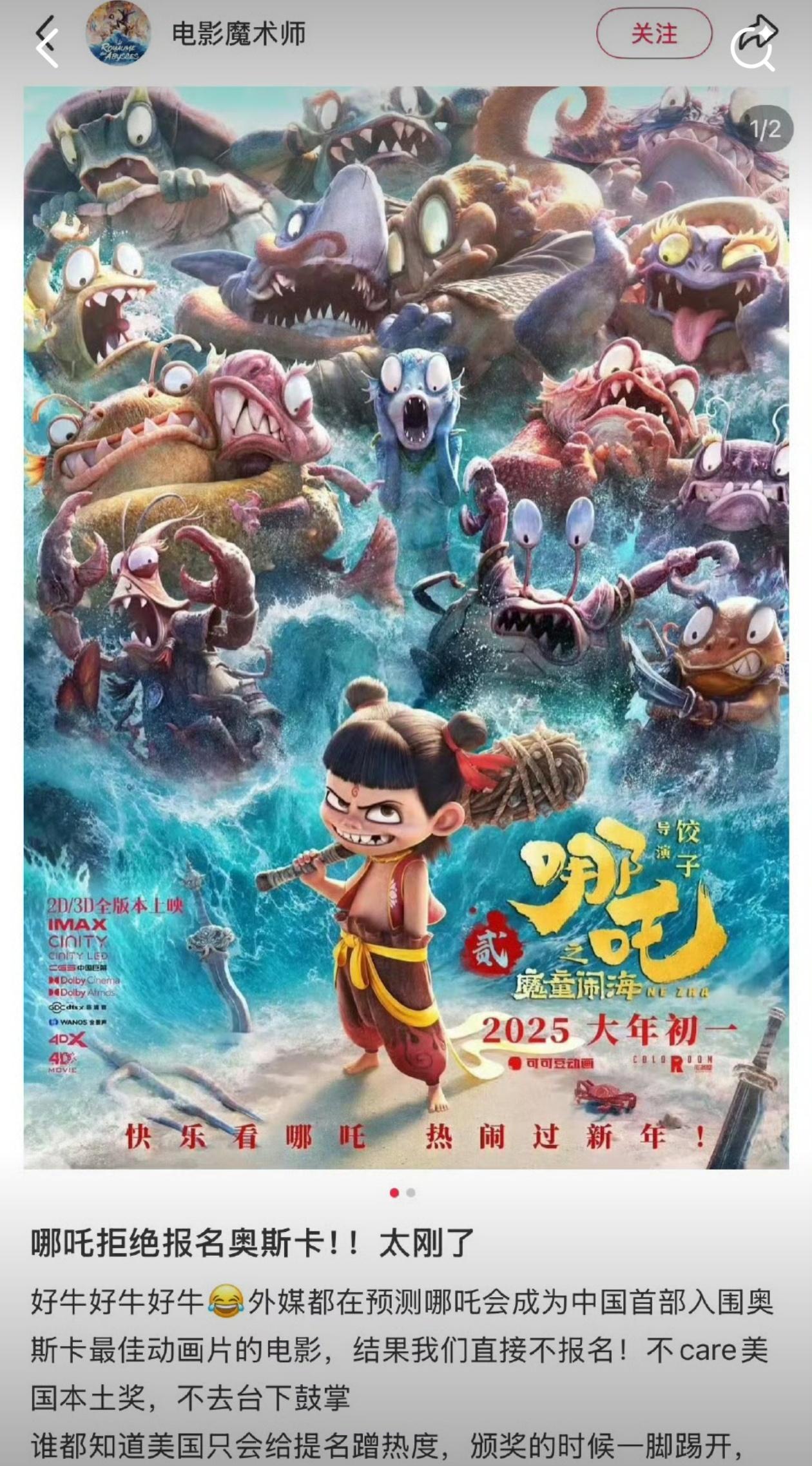 11月21日,美国电影艺术与科学学院公布了第98届奥斯卡“最佳动画长片奖”的35部符合参评资格的大名单,《罗小黑战记2》成功入围,成为本届唯一入选的中国动画电影,《哪吒之魔童闹海》未出现在名单中,原因是片方未提交报名申请,并非不符合参评资格。在我看来,好的艺术作品,源于群众满意的口碑,不需要得到某个奖项的认可,《哪吒2》日前获得金鸡奖最佳美术片奖,主创团队也没有派人去现场领奖。事实上,《哪吒2》全球票房突破154亿元,不管是商业价值,还是画面艺术,都是观众有目共睹的,《哪吒2》出品方华人文化选择不参与本届奥斯卡角逐,属于片方自主选择,没必要衍生太多阴谋论。