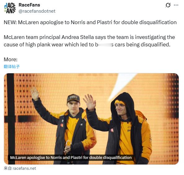 迈凯伦车队领队安德里亚·斯特拉:“我们向兰多和奥斯卡道歉,在两位车手整个周末的出色表现后,这个冠军争夺战的关键时刻让他们痛失积分。作为车队,我们也要向支持我们的合作伙伴和车迷致歉。”“正赛期间,两辆赛车都出现了练习赛中未遇见的异常剧烈海豚跳现象,导致与地面接触过度。我们正在调查车辆出现这种状况的原因,包括赛后发现的、两车意外遭受的损伤影响——这些损伤导致了底板活动幅度增大。”“正如国际汽联所指出的那样,这次违规是无意的,并不存在任何试图规避规则的故意行为,而且当时也存在减轻情节。虽然这个结果令人极其失望,但我们仍将全力专注于本赛季最后两场比赛。”