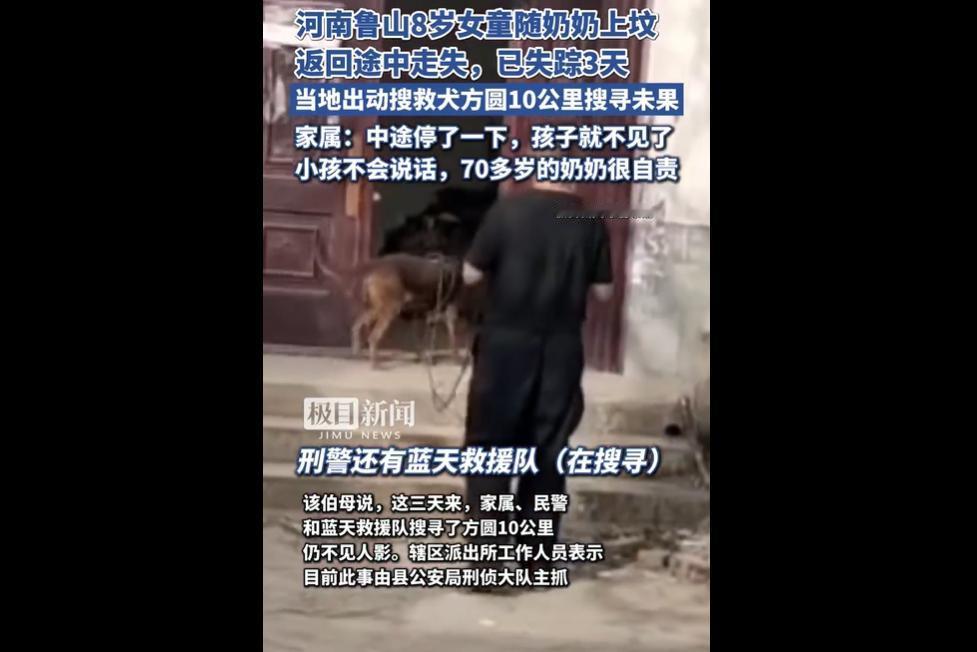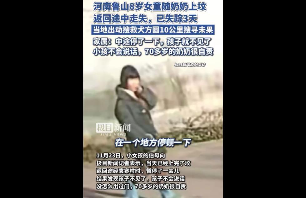 河南鲁山 8 岁女童耿子涵有智力障碍且不会说话,11 月 20 日随奶奶上坟返回途中,在袁寨村附近走失。 家属、蓝天救援队及民警已搜寻方圆 10 公里未果,搜救犬从走失点嗅源直追到女童家中却未找到人。 目前刑侦大队主抓此事,派出所协助调查,网友猜测或有复杂隐情,70 多岁的奶奶因孩子走失十分自责。 这事儿看得人揪心又纳闷!8 岁女童上坟途中走失,方圆 10 公里搜了三天没踪影,连搜救犬都 “追着气味回家” 却找不到人,简直像现实版 “寻踪谜题”。 孩子不会说话还没怎么出过门,想想就让人捏把汗。 刑警介入让事件多了层悬念,希望警方能快点找到线索,也盼着有知情者能提供帮助。