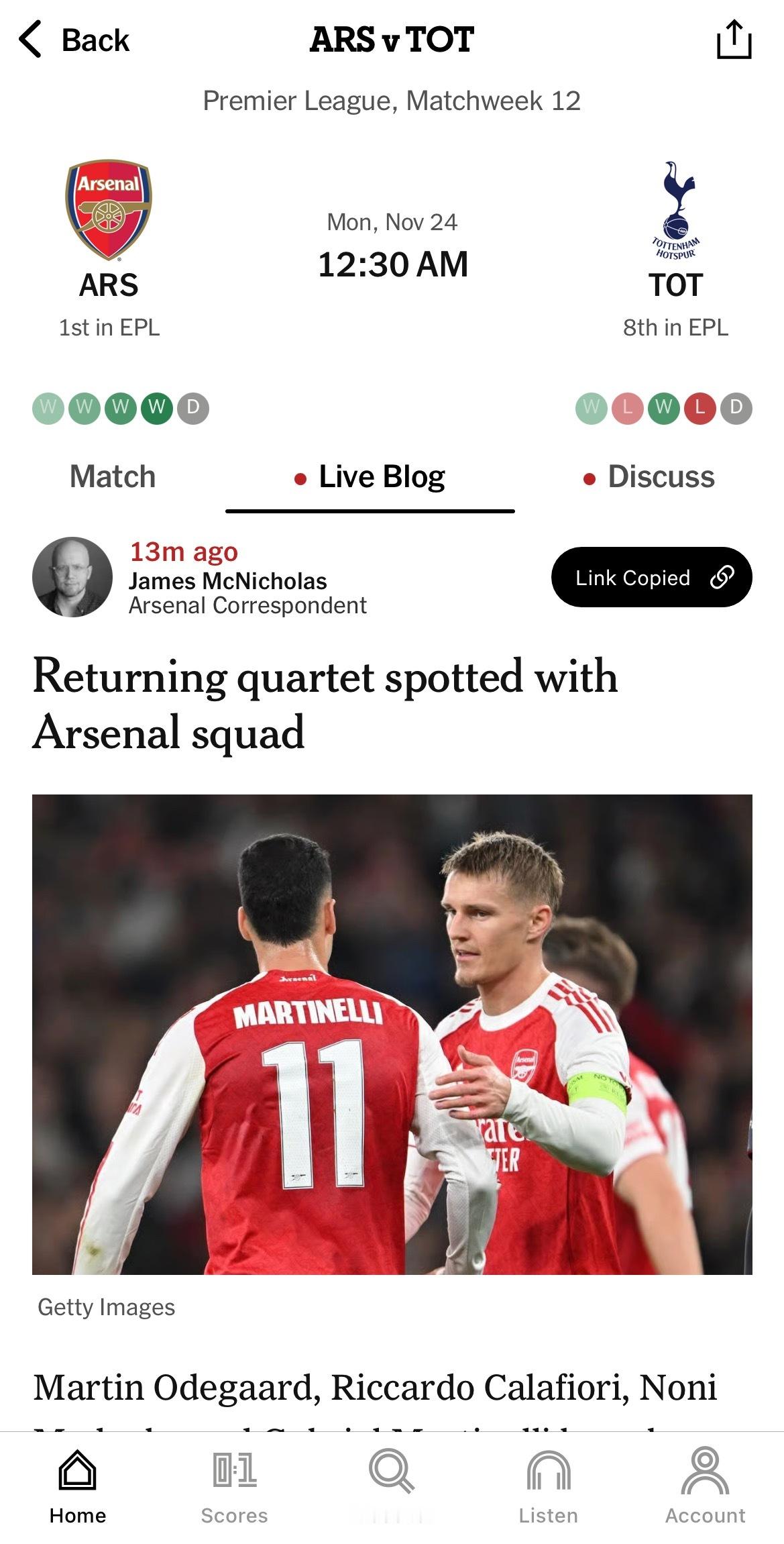 The Athletic James McNicholas:在北伦敦德比开始前,当阿森纳球员离开其位于伊斯灵顿的酒店时,有人看到马丁·厄德高、卡拉菲奥里、马杜埃凯和马丁内利与球队在一起。阿森纳将于今日晚些时候对阵托特纳姆热刺,阿尔特塔希望迎来多名球员伤愈复出。球队于今晨进行了赛前散步,厄德高、卡拉菲奥里、马杜埃凯和马丁内利均在队伍中。他们随队现身并不保证会进入比赛名单——众所周知,阿森纳曾有过球员在酒店与大队在一起但最终未入选比赛日名单的情况。然而,这确实表明,在开球前不久公布的球队名单中,阿尔特塔或许能为阿森纳球迷带来好消息。马杜埃凯自九月对阵曼城的平局后便未再出场,而厄德高和马丁内利自十月以来一直缺席。卡拉菲奥里错过了十一月的国际比赛日期间意大利队的两场比赛,但其缺席主要原因是负荷管理而非特定伤病。未见维克托·哲凯赖什或凯·哈弗茨的踪影,这表明这对锋线搭档仍在从伤病中恢复。
