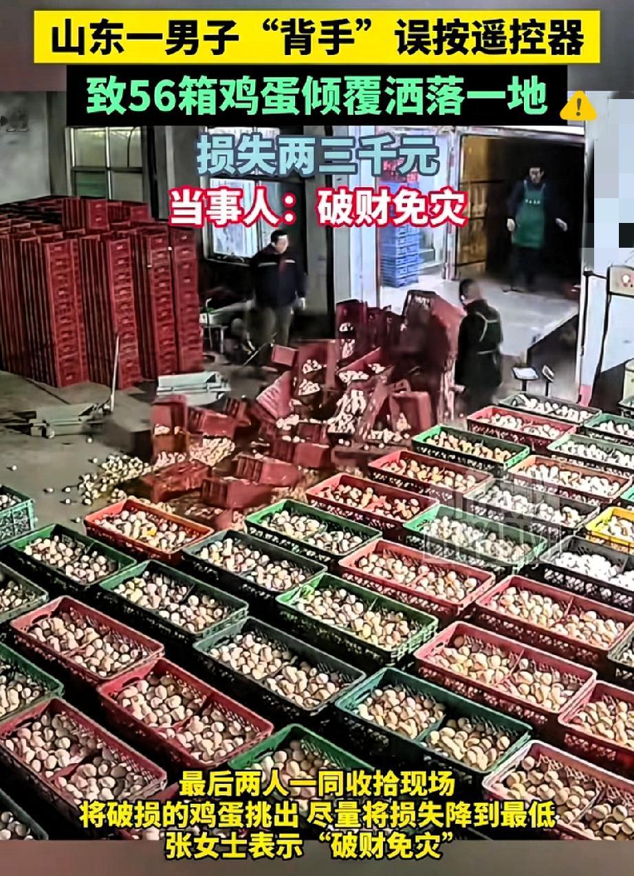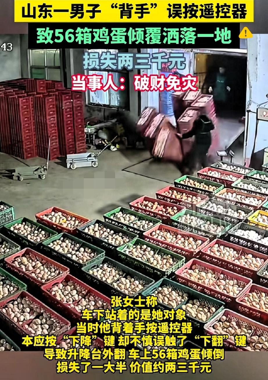 自信是好事,但“盲目自信”真的会把人坑惨! 山东济南这哥们儿卸鸡蛋的操作,看完又气又笑。 明明是细活儿,他却背着手按遥控器,想耍个熟练的帅,结果把下降键按成了下翻键。 升降台瞬间外翻,56箱鸡蛋哗啦啦全倒了,一大半摔得稀碎,直接损失两三千块。 换谁看了都得上火,女子当场把对象臭骂一顿也不奇怪。 但骂归骂,两人还是冷静下来收拾现场,把好鸡蛋挑出来尽量减损。 对象也总算长记性,说以后按遥控器肯定盯着看,再也不敢大意。 其实很多灾祸都不是大事酿成的,就是仗着“我熟”“没事”的侥幸心理。 再熟练的事,少了一份谨慎都可能翻车。 你有没有因为一时大意,搞出过让人哭笑不得的损失?