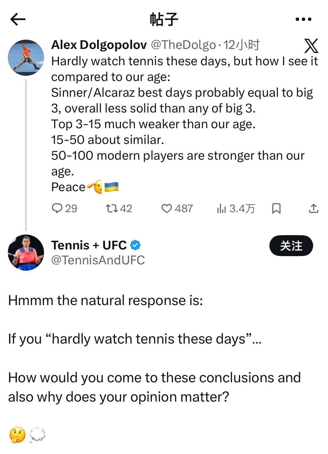 一度弃拍从军的前乌克兰球员多尔戈波洛夫突然回归网球话题,他发帖说:“最近很少看网球,但我是这么比较现在和我们那个年代的。辛纳和阿卡的最佳状态堪比三巨头,但总体还不如任一巨头那样强悍;排名3-15位的球员,比当年差了很多;排名15-50位的球员,和当年差不多;排名50-100位的球员比当年更强。求别杠🫡”不知道你们同意不同意,排名第三的兹维列夫估计会有点不同意见PS,本赛季年终排名第三到第十五位的球员分别是:兹维列夫、德约科维奇、阿利亚西姆、弗里茨、德米纳尔、穆塞蒂、谢尔顿、德雷帕、布勃利克、鲁德、梅德维德夫、弗基纳、鲁内。我顺便看了一下原po的回复,热评第一位:“如果你最近很少看网球,那是怎么得出这个结论的,你的意见有什么价值?”peace🫡