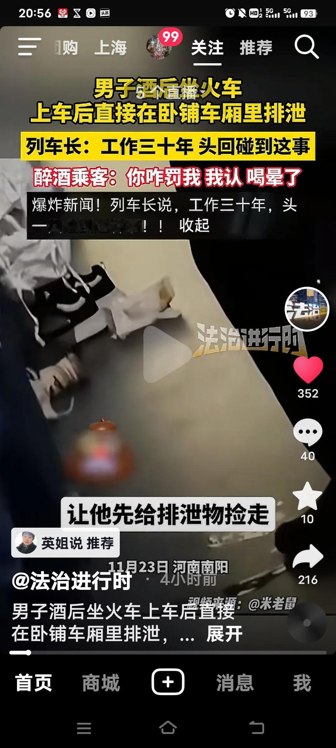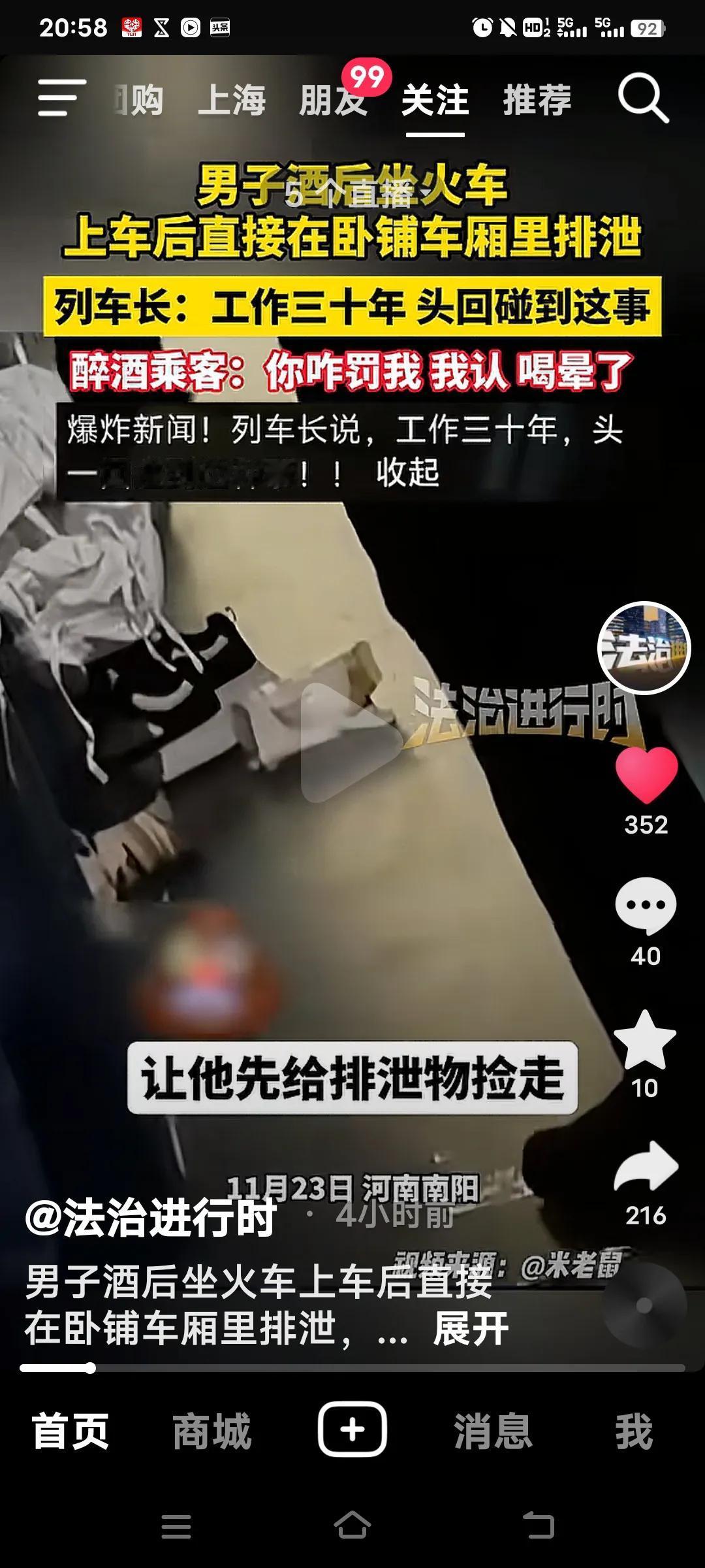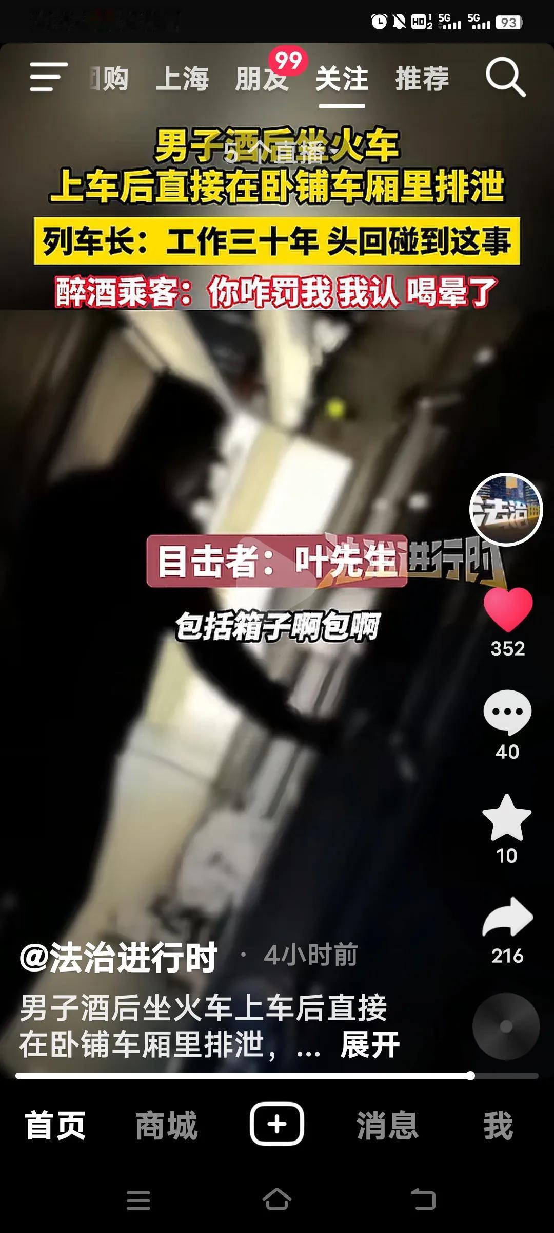 11月22日深夜,K168次列车正从河南洛阳驶往浙江宁波。当列车停靠在南阳站附近时,一件奇葩事发生了。一名男子饮酒过量,神志不清,竟直接在卧铺车厢里大小便。 据目击者叶先生描述,该男子在车厢里又拉又尿,周边乘客的鞋子和箱子都未能幸免。事后经过协商,他应该对受影响的乘客进行了赔偿。画面中,车厢已经熄灯,乘客们都在休息,过道里却出现了排泄物,列车工作人员赶忙前来处理,还让当事旅客用纸将排泄物捡起,丢进厕所。 列车长也十分震惊,称自己工作三十年,还是头一回碰到这种事。好在到了23日下午,工作人员表示双方已协商解决此事,且双方对结果都很满意。醉酒乘客解释道:“我真的是喝多了,你们怎么罚我都认,当时喝晕了!” 这件事着实令人糟心。看来喝酒还是要有个度,否则很容易给他人造成影响。 t57次列车 Z287次列车 Z137次列车