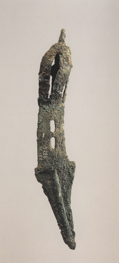 首都博物馆藏1975年昌平白浮出土西周早期:镂空带铃匕首. 长36.5cm, 直接在匕首上设置铃铛还是非常少见的, 有北方草原民族风格.