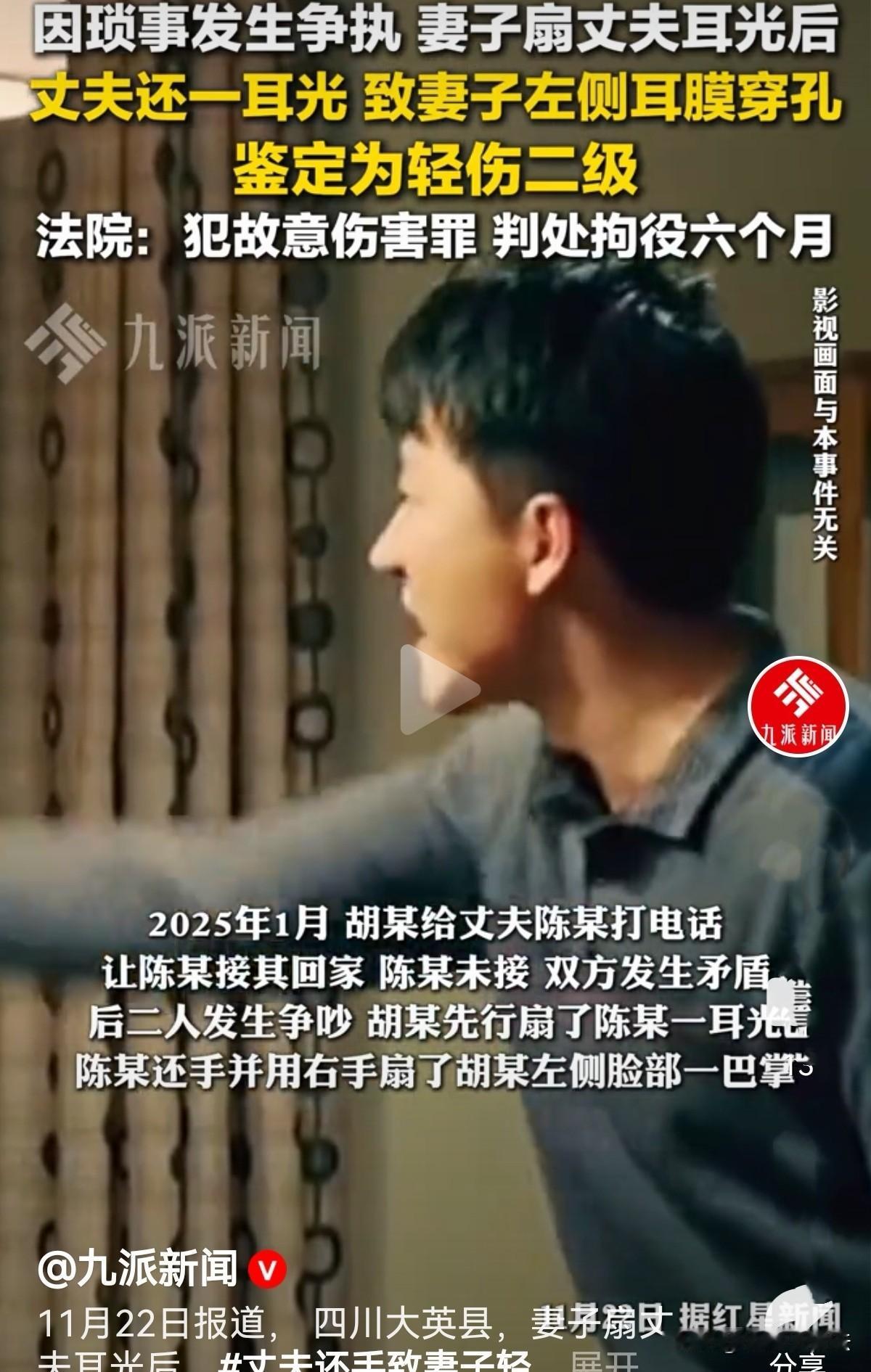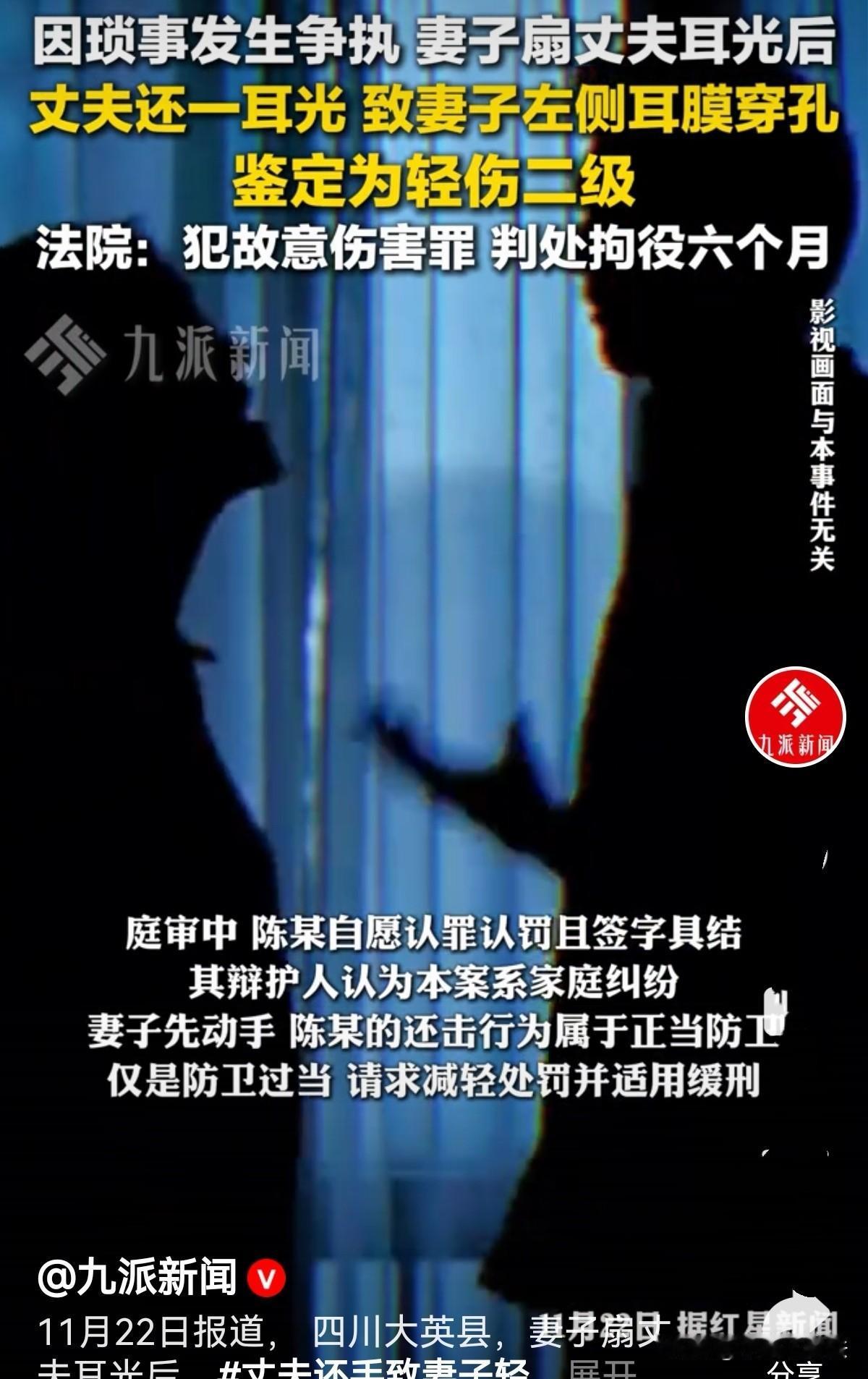 四川大英,晚上,丈夫没接妻子回家,她打车到家后非常生气,就与丈夫大吵,妻子情绪激动上去扇了丈夫一个响亮的耳环,被激怒的丈夫反手还了一巴掌,两人撕扯起来,大姨姐过来劝架,男子摔门而出。妻子感觉耳鸣,次日去医院检查,诊断为耳膜穿孔,损伤程度为轻伤二级。妻子报警,丈夫被以故意伤害罪提起公诉,丈夫律师辩护:其还击应为正当防卫,仅是防卫过当!法院判决,丈夫傻眼了! 2025年1月23日晚8点,胡某裹紧外套站在路边,手指一遍遍划过手机屏幕,丈夫陈某的电话始终无人接听。 她下午和闺蜜逛街时喝了点红酒,此刻酒意混着委屈翻涌,明明丈夫说好了下班来接她,现在却连电话都不接,是不是心里根本没把她当回事? 越想越气的胡某拦了辆出租车回家,进门就看到陈某窝在沙发上吃着零食刷着手机。 她气不打一出来,把包往茶几上一摔,怒气冲冲地喊道:叫你接我你不接,电话也不回,你到底在干嘛? 我加班累死了,你自己不会打车?多大点事非要闹脾气?陈某不以为然。 “你除了会玩手机还会干嘛?当初真是瞎了眼才嫁给你!”胡某情绪激动,言语更加刻薄。 陈某忍无可忍与她争吵起来,两人从接人这事扯出陈芝麻烂谷子、鸡毛蒜皮,你一言我一语吵得不可开交。 被丈夫的态度彻底激怒的胡某,脑子一热抬手就给了陈某一个清脆的耳光。 正在气头上的陈某,被这一耳光打得晕头转向,愤怒、屈辱一股脑涌上心头。 愤怒情绪让他失去了平时的容忍和谦让,一时忘了夫妻情分,他扬起右手,狠狠扇在了胡某的左侧脸上一巴掌。 胡某被打了一个趔趄,她没想到陈某会还手,委屈和愤怒让她失去了理智,扑上去就和陈某扭打在一起,指甲抓挠着他的胳膊,嘴里还不停咒骂。 两人在沙发上、地板上翻滚拉扯,家具被撞得砰砰作响。 就在这时,住在隔壁的胡某姐姐胡某甲听到动静,赶紧推门进来劝架。“你们这是干嘛!都是一家人,有话好好说啊!” 大姨子一边大声劝阻,一边使劲把两人分开。陈某一看大姨子过来,赶紧松开手,他气得脸红脖子粗,大口喘着粗气。 看着妻子又吵又跳,还没完没了,他转身抓起外套就摔门而去。 陈某走后,胡某感觉左耳像有无数只蜜蜂在里面嗡嗡叫。耳鸣、听力下降,连姐姐说话的声音都变得模糊。 第二天一早,胡某在姐姐的陪同下来到医院,经过详细检查,医生告知她左侧耳膜穿孔,需要立即治疗。 这就是他打的!胡某有些崩溃,当即报了警。 警方介入后,对事件调查取证和胡某进行伤情鉴定。鉴定结果是:胡某的损伤程度为轻伤二级。 拿到鉴定报告的那一刻,胡某咬着牙说:他这是故意伤害,我一定要追究他的责任。 我不是故意要伤害她的,是她先打我,我一时冲动才还手的,真不知道会这么严重!陈某在派出所里反复解释,言语间满是慌乱。 他主动交代了事情的全部经过,之后又到公安机关自动投案。 很快他被检察机关以故意伤害罪提起公诉。 法庭上,陈某低着头满脸愧疚,不停地说:我错了!我认罪!希望妻子原谅。对公诉机关指控无异议,表示认罪认罚,签字具结。 陈某辩护人提出,本案因家庭纠纷引发,胡某先动手打人,陈某还击属于正当防卫,只是防卫过当,请求法院减轻处罚并适用缓刑。 《刑法》第20条第1款规定:……财产和其他权利免受正在进行的不法侵害,而采取的制止不法侵害的行为,对不法侵害人造成损害的,属于正当防卫,不负刑事责任。 第2款规定:正当防卫明显超过必要限度造成重大损害的,应当负刑事责任,但应当减轻或免除处罚。 法院审理认为,的确是胡某先扇了陈某一耳光,这个行为确实属于不法侵害。 但这种侵害的程度很轻微,并没有对陈某的人身安全造成严重威胁。 而陈某的还手行为,主观上是出于愤怒和报复的心理,他是因被妻子打了觉得丢面子,才反过来动手打人,并不具备防卫意图。 陈某的一巴掌却导致胡某耳膜穿孔,构成轻伤二级。这种反击行为已超出了制止不法侵害的范畴,符合故意伤害罪的构成要件。 《刑法》第234条规定:故意伤害他人身体的,处3年以下有期徒刑、拘役或者管制。…… 陈某的行为已构成了故意伤害罪,应当在3年以下有期徒刑、拘役或者管制的幅度内量刑。 《刑事诉讼法》第15条:犯罪嫌疑人、被告人自愿如实供述自己的罪行,承认指控的犯罪事实,愿意接受处罚的,可以依法从宽处理。 对于自首的犯罪分子,可以从轻或者减轻处罚。 虽本案因家庭纠纷引起,但被告人陈某犯故意伤害罪,造成妻子轻伤二级的后果,社会危害性不可忽视,不适宜适用缓刑。 最终法院判决:判处陈某拘役6个月。 有人说,男人有点过了,婆娘是拿来疼的,就算女人不对,作为男人也不能轻易打女人,更何况是同床共枕的女人! 有人说,这最多算是家庭矛盾而已,是女的先动的手,男的是反击而已。不应该是故意伤害! 有人说,这个女的这是不想过了,不想想男人坐牢的后果! 对此您怎么看?