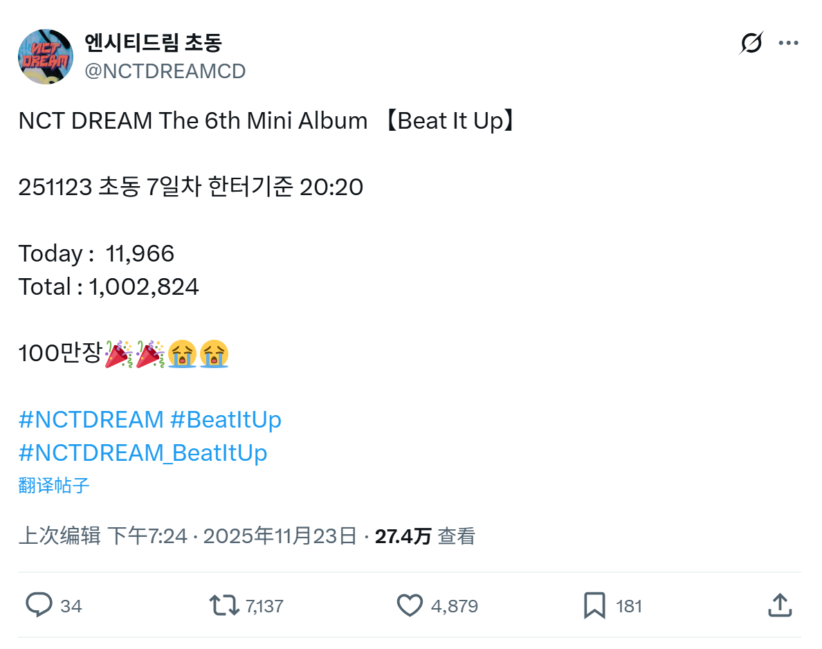 【Theqoo】实时NCTDREAM成为SM旗下首位连续10次获得百万销量的团