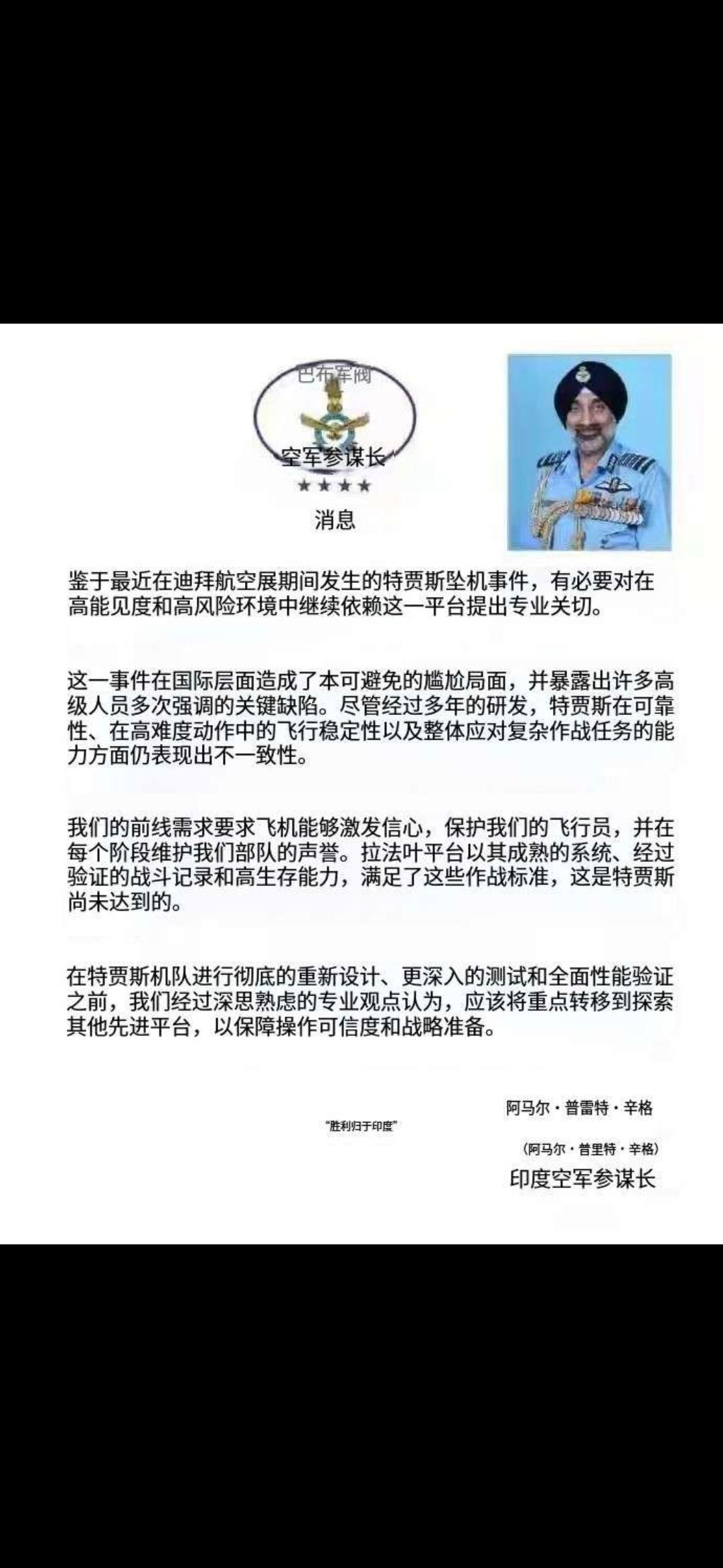 真正的印度精英,印度空军现役四星空军军官,现任印度空军参谋长辛格,终于忍不住了,站出来给印度全体空军人员发了一封公开信,公开信的内容是激烈批评印度的“光辉”战机,说“光辉”战机在高风险场景中可靠性不足,这一次在迪拜发生的事故更是丢脸丢到全世界了; 他还说,印度“光辉”战机,已经研发了多年,但是仍旧存在稳定性、作战适配性等核心缺陷,非常拉胯;而作为一个实用主义至上的空军人员,辛格认为,军事是非常严肃的一件事情,既然“光辉”战机有缺陷,那么就不应该继续使用,印度空军应该使用更加成熟的法国阵风战机平台,法国阵风战机平台足够成熟,也经历了足够多的实战检验。 最后,辛格更是严肃提出建议,暂停使用“光辉”战机,等到真正将其改造好,验证好,直到其没有问题之后,再拿出来使用,在这之前,就先用其他机型。 辛格不是一般人,这是从印度空军底层,一步一个脚印成长起来的真正的印度军事精英,他是一个实用主义至上的存在,深刻了解印度空军的不足,对于光辉战机,更是早就不满。因为,印度的这个光辉战机,问题太多了,已经研发了很多年,但是依旧不合格,而在这样的情况下,印度政府为了“面子”,还是强硬要求印度空军采购大批“光辉”战机,花了很多钱,买了一批根本没啥作用的样子货,辛格内心之愤怒,可想而知。 因此,这一次,他终于不忍了。 直接给印度全体空军发公开信! 正面炮轰“光辉”战机! 实在是,印度空军已经苦“光辉”战机已久,印度政府要搞“印度制造”,这个大家都能理解,但是不能拿一个不合格的产品,就硬塞进来,这样做,除了拉低印度空军的战斗力,还能做什么? 辛格这一封公开信,可以说是对莫迪明晃晃的打脸了,因为“光辉”战机,正是莫迪强推的“自主国防”的核心门面工程,他这样做,风险很大,说不定接下来可能因此直接被免职,不过他还是这样做了,估计是内心深处的怒火,积压多时,到了这个时候,再也无法忍耐。 不过,他的这个声明,估计不会有什么作用,根本不可能改变印度空军的现状,毕竟“印度制造”,一直以来都是如此,沉疴难愈。