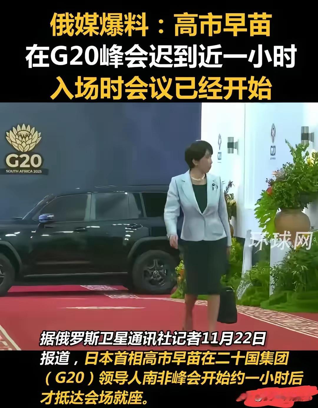 奇葩!日本政客高市早苗既然在G20迟到1小时 国民:脸丢到全世界 近日G20峰会现场上演戏剧性一幕,日本政客高市早苗竟迟到近一小时,进场时会议已正式开启。这一行为不仅打乱会议节奏,更在日本国内引发轩然大波,让向来以守时为荣的日本民众炸开了锅。 在日本,守时早已不是简单的时间观念,而是刻进骨子里的社会铁律。日常里,上班族提前十分钟到岗是常态,朋友聚会迟到五分钟就得郑重道歉,就连快递员送货都精准到分钟。这种极致的守时文化,早已成为日本对外展示的亮眼名片,被国民视作引以为傲的精神符号。 此次高市早苗在国际峰会上的迟到,无疑给这份骄傲泼了一盆冷水。日本网友炸开了锅,有人直言这比错过新年抢福袋还让人抓狂,毕竟福袋能等明年,国民口碑碎了可难拼凑;还有人调侃,以后再跟外国友人吹嘘日本守时,都得先看看日历有没有被打脸。 这场迟到究竟是交通延误的意外,还是对国际场合的疏忽大意?你觉得一国政客在国际会议上迟到,是否该被严肃追责?高市早苗内阁 高市早苗下台