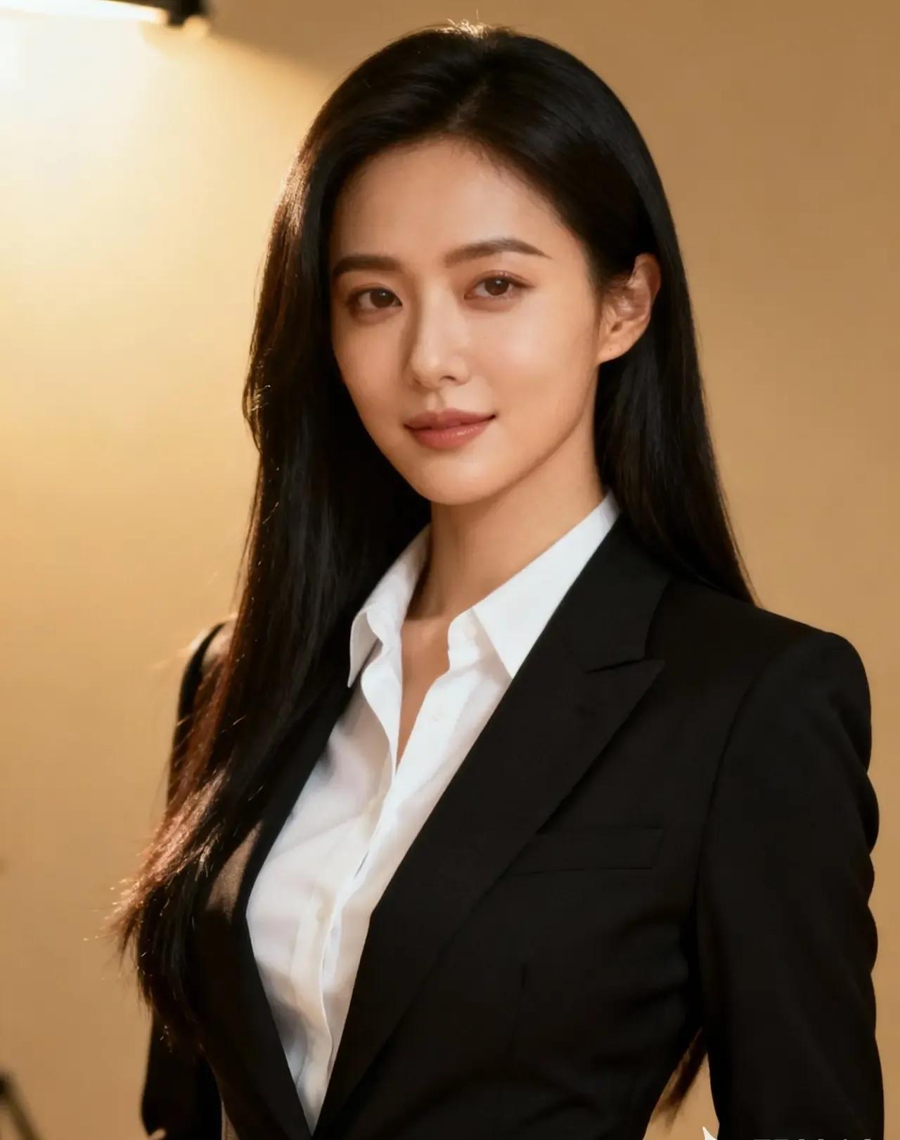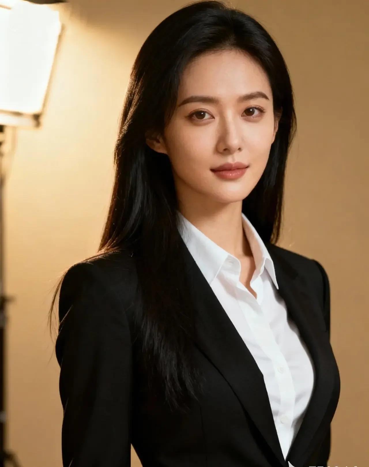这位美女穿着白衬衫和黑裙子,搭配珍珠项链,显得优雅大方。