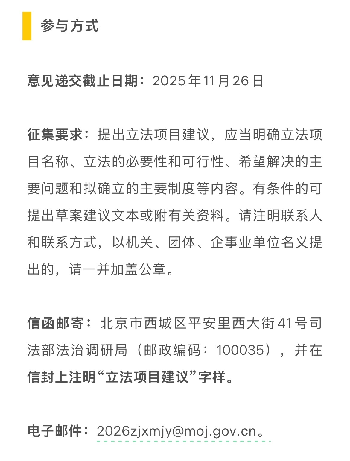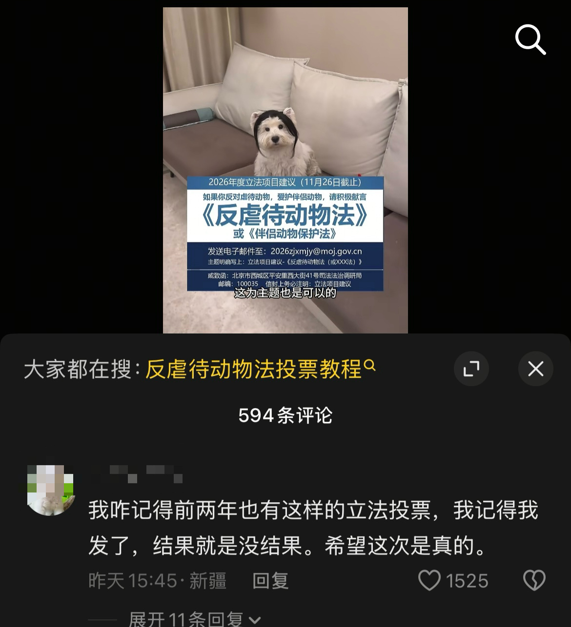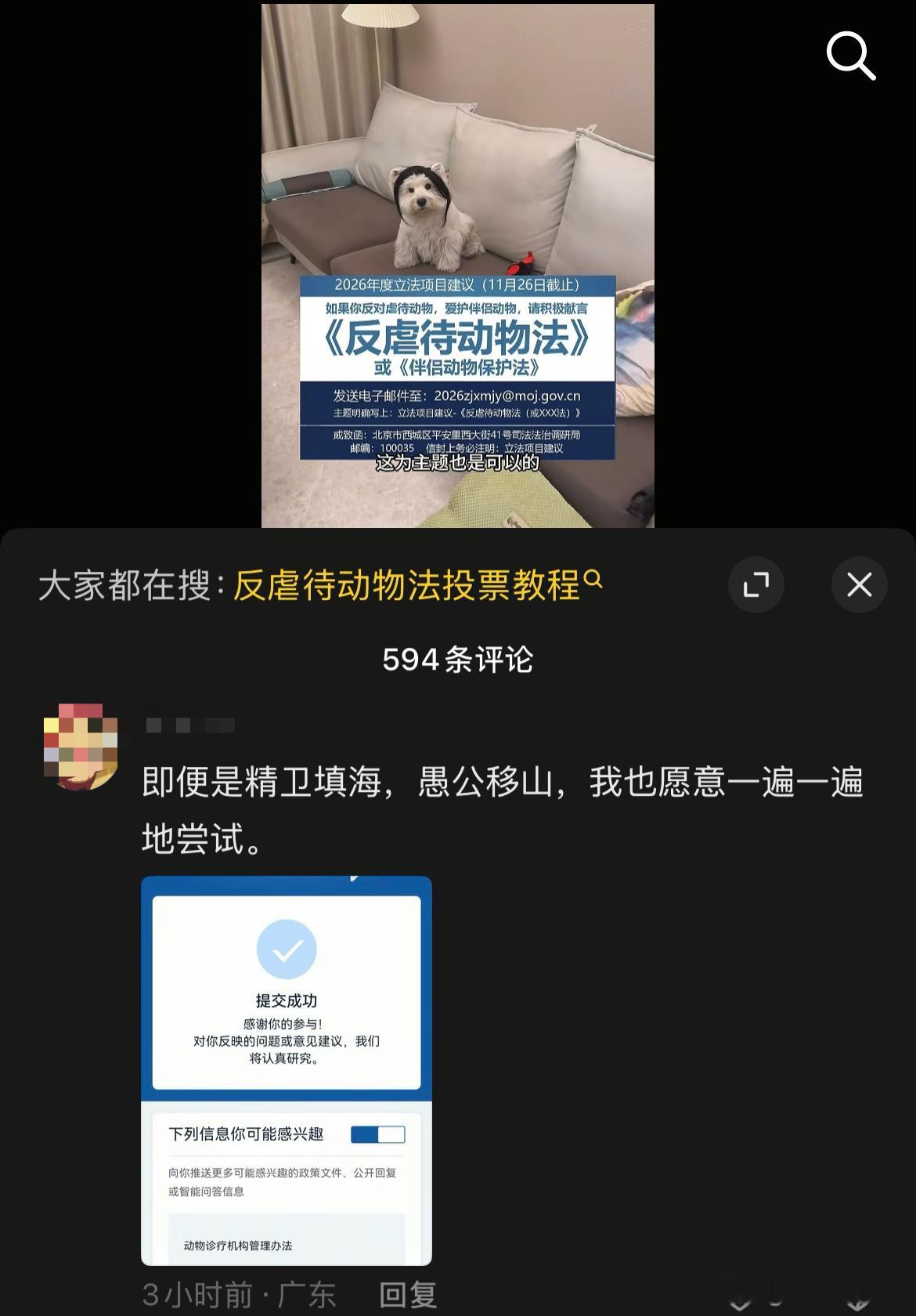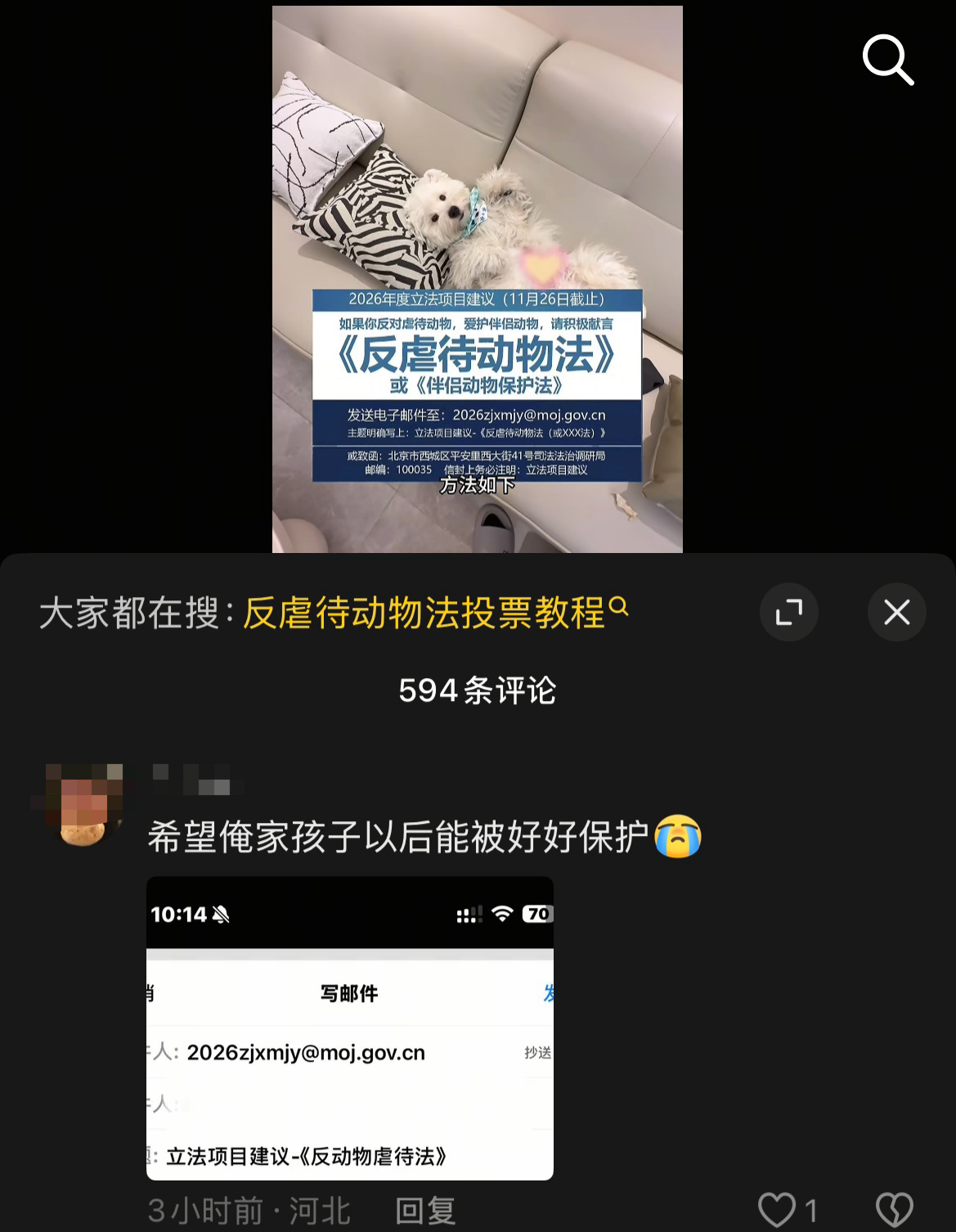 路过的一定要看看!助力《反虐待动物法》加速成立!“希望毛孩子们能被保护”“支持立法提高养宠家长的素质,有法可依”“不管有没有用希望千千万万个我一起努力”“即使精卫填海、愚公移山也要一遍遍尝试”图1有收件地址及邮件主题书写格式,2025.11.26截止。