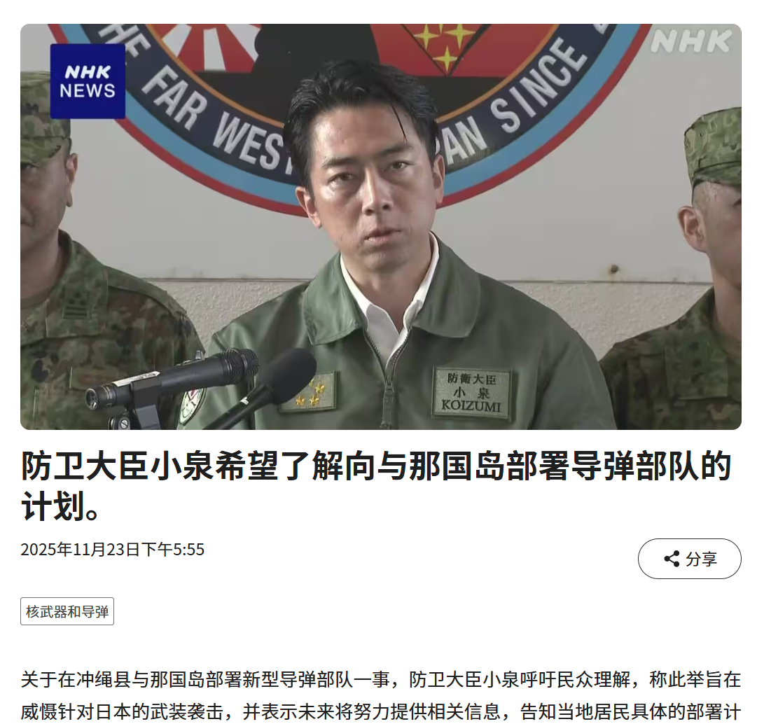 🔻日本最近不但不收敛,而且还在推进靠台湾侧的军事部署。🔻日本防相小泉今日前往距离台湾仅110km的琉球群岛最南端与那国岛,发言说要在当地部署导弹系统。🔻虽然目前消息只是部署日本的03式中短程防空导弹系统,但是未来部署爱国者,乃至反舰导弹系统都是有可能的,这个口子一开。🔻所以说我们开始造琉球的宣称,是很有必要的。