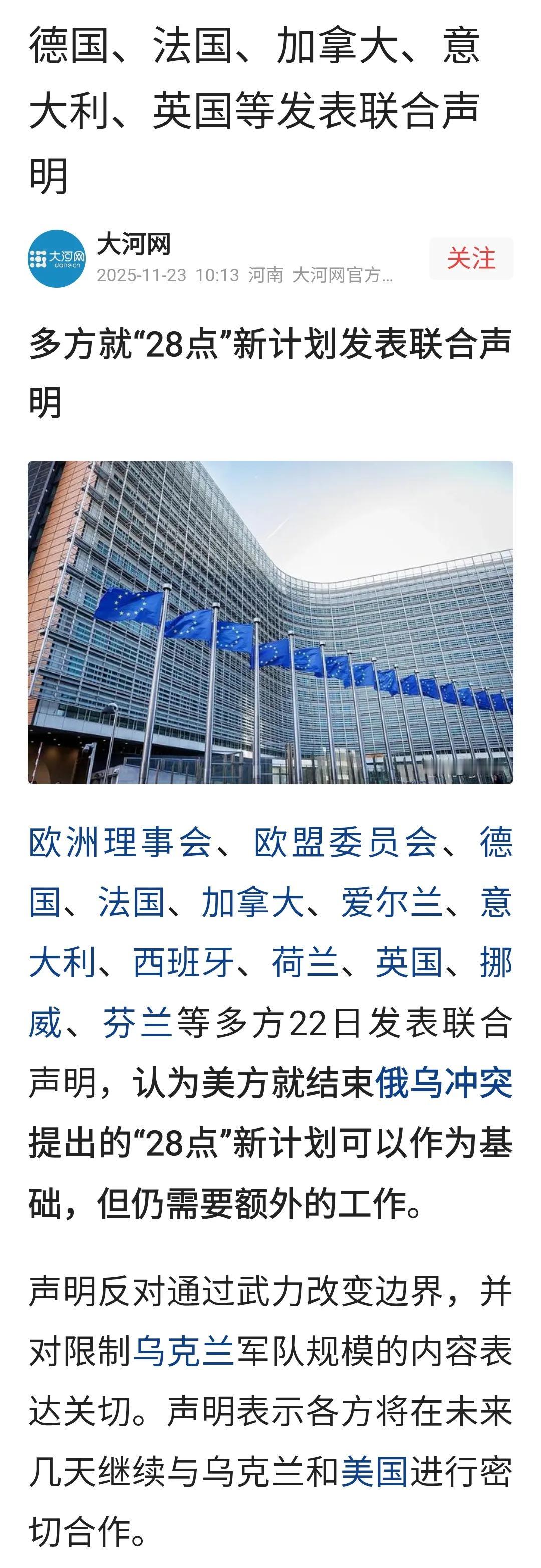 欧洲多国发表联合声明,说28点和平计划可以作为基础? 这基础是建立在什么之上? 商量了这么多天?就得出这个结果? 怪不得美俄出协议不与他们商量?