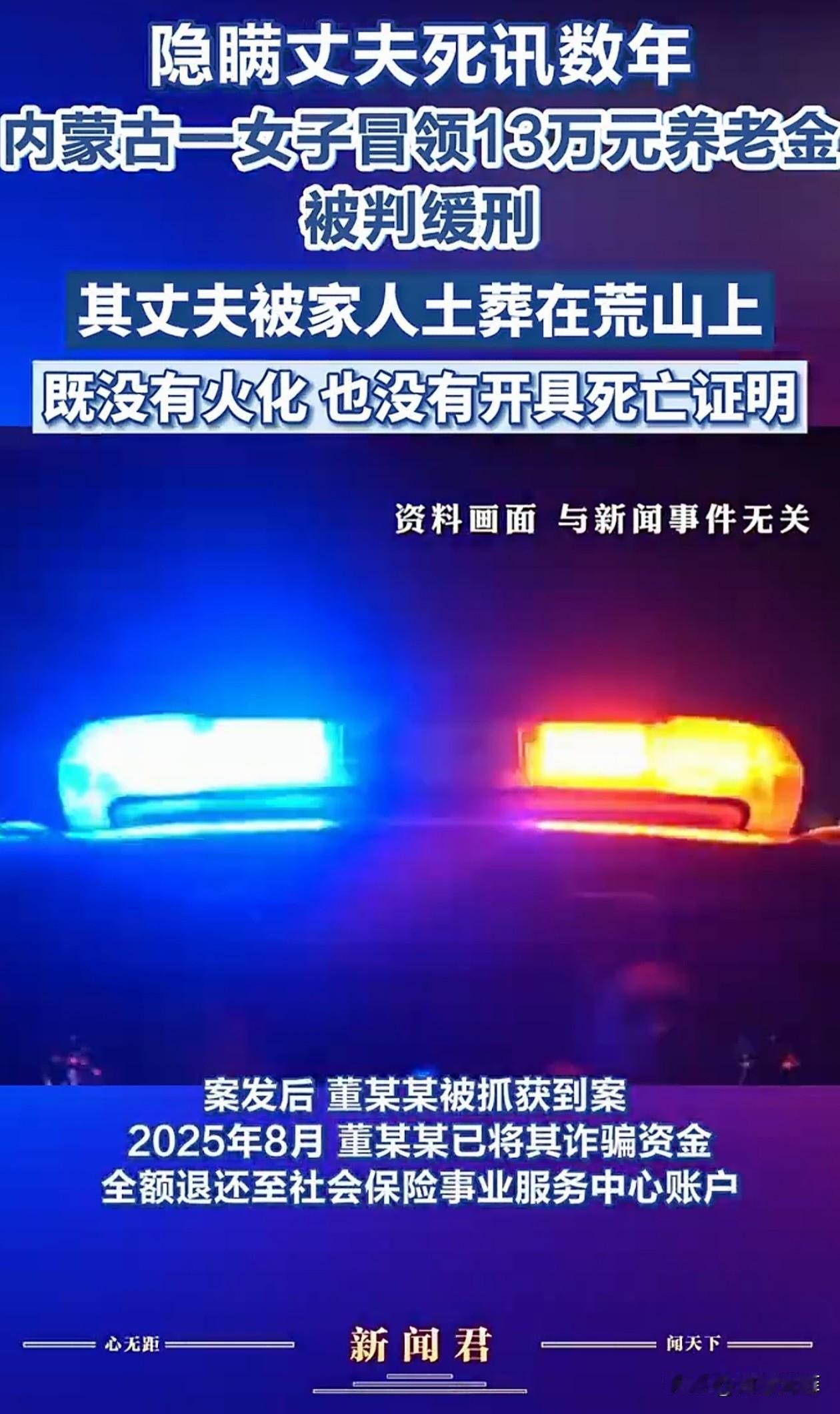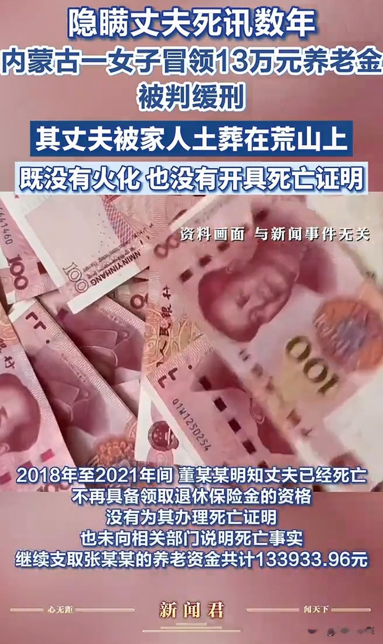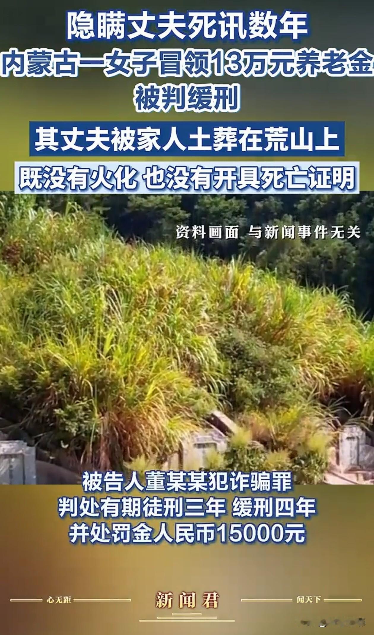 内蒙古,女子的丈夫去世了,但女子选择隐瞒,因为她想继续领取丈夫的养老金,四年时间,一共领取了13万,最后还是被发现获刑。 2017年12月,女子的丈夫去世了,家里人没按流程办火化,直接把人土葬在了自家附近的荒山上,也没开死亡证明。 女子心里很清楚,丈夫去世了就没资格领他的养老金了,所以她隐瞒了下来。 从2018年开始,她就跟以前一样去银行取丈夫的养老金,第一次取款时她还很紧张,可发现没人查,之后就越来越大胆。 她这一取就取了四年,总共拿了13万多。有知情人说,她家条件不算好,儿子要读大学,家里老人还常年吃药,她一开始就想取几个月过渡下,没想到彻底收不住手了。 2025年8月,女子被警方抓住了,法院审理后认为,女子的行为已经构成了诈骗,而且骗的数额不算小。 但考虑到她不仅坦白了罪行,还把钱全退还回去了,认罪态度也特别好,就从轻发落了。 11月10日,法院判了她有期徒刑三年,缓刑四年,另外还得交15000元罚金。 其实她本来可以走正规流程,继承丈夫养老金账户里的余额,结果一时糊涂触碰了法律红线,最后落得这样的结果。