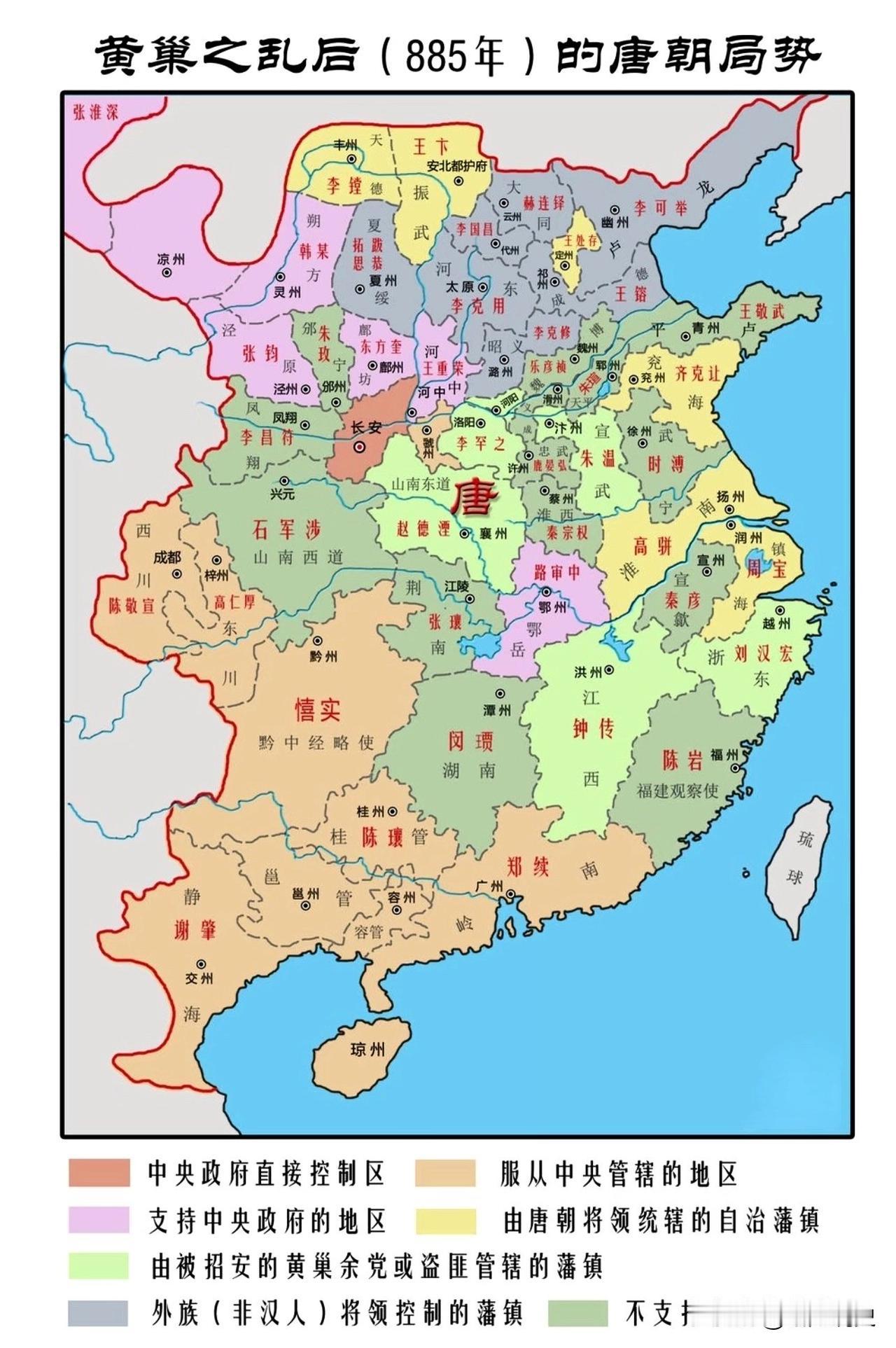 公元885年黄巢之乱后的唐朝形势,如果说黄巢之乱前,唐朝中央朝廷在地方上还有一些威信和支持势力,遮羞布还在,那么,黄巢之乱后曾经的大唐帝国就已经名存实亡,再也没有了中兴的机会。 此时,各藩镇军阀虽然相互混战,但没有明显的霸兵崛起,还没有出现强大到取代李唐王朝的军阀大势力,这才让唐朝继续苟延残喘了20余年,直到朱温(后梁)及李存勖(后唐)等人的崛起。 唐朝