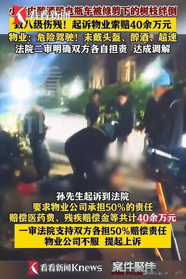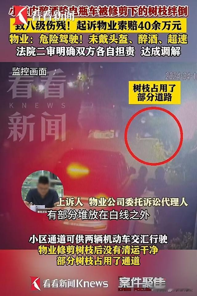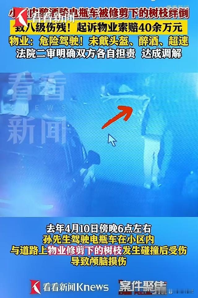 上海,孙先生醉酒后在小区里骑电瓶车,撞上修剪树木后堆放在一边的树枝摔成八级伤残。案发后,孙先生及妻子起诉物业索赔40余万,物业喊冤:路那么宽,小轿车都可以正常通行,他摔伤是因为超速行驶且不戴头盔! 据看看新闻、潇湘晨报.晨视频等报道,孙先生是某小区的业主,2024年4月10日,孙先生在小区门口的一个小餐馆吃饭。 饭后孙先生回到家洗漱完,一摸口袋才发现手机不见了,孙先生仔细一回忆,想起吃饭时手机放在桌子上,临走时忘拿了。于是,孙先生又骑上电瓶车回去取手机。 事发当天,小区物业正组织人修剪小区里的树木,因为天色渐暗,树枝只清理走了一部分,还有很多没来得及运走的,就靠边堆放在了路边。 孙先生所在小区的内部道路可以并排行驶两辆车,因部分树枝非常粗壮,虽然工人尽量往边上靠,部分树枝仍旧占用了一点道路,但车辆和行人可以正常通行。 孙先生取完手机后,风一吹酒劲上涌,不知不觉间骑得越来越快,18时左右,没戴头盔的孙先生突然撞到了路边的树枝上。 孙先生摔倒后造成了颅脑损伤,构成了十级伤残,另外,这次事故导致孙先生患上了器质性精神障碍,伤残等级为八级。 案发后,孙先生及家属认为,事故是因物业将修剪下来的树枝放在路边导致的,因此要求物业承担50%责任,赔偿自己40余万元。 一审支持了孙先生的诉讼请求,可物业不服又提起了上诉。 物业认为,当天虽然他们修剪了树枝,树枝也占用了部分道路,但是路面可供行人及车辆正常通行。 孙先生发生事故,主要是因为他未佩戴安全头盔醉酒驾驶电瓶车,且超速行驶,而且那辆电瓶车的制动还存在问题,孙先生应该自行承担事故责任。 可孙先生及妻子认为,孙先生虽然当天喝了酒,但是并没有喝多。孙先生摔倒是因为树枝占用了大量位置,又没有在旁边设置防护和警示标志,孙先生躲避不及才摔倒的。 对此,物业辩解称,他们虽然没有在树枝旁边设置防护装置,但在路边放置了写有减速慢行的提示牌。 那么,本案从法律角度应该如何分析? 首先,《民法典》第一千二百五十六条规定,在公共道路上堆放、倾倒、遗撒妨碍通行的物品造成他人损害的,由行为人承担侵权责任。 物业组织修剪树木后,将树枝堆放在小区通行道路边上,虽树枝已靠边堆放,但仍占用了一定道路空间,且未设置防护和警示标识,对公共道路的通行造成了妨碍。 物业作为树枝堆放这一行为的实施者,未尽到合理的管理义务和审慎义务,导致孙先生撞上树枝受伤,因此应承担相应的侵权责任。 同时,依据《物业管理条例》第三十五条规定,物业服务企业应当按照物业服务合同的约定,提供相应的服务。物业服务企业未能履行物业服务合同的约定,导致业主人身、财产安全受到损害的,应当依法承担相应的法律责任。 物业在小区内进行树木修剪工作,有义务保障小区道路的安全通行条件,其未及时清理树枝并设置警示标志,违反了物业服务合同中保障小区安全的相关约定,也应承担相应责任。 同时,《道路交通安全法实施条例》第七十二条规定,在道路上驾驶自行车、三轮车、电动自行车、残疾人机动轮椅车应当遵守下列规定:(三)不得醉酒驾驶。 孙先生在醉酒状态下驾驶电动自行车,明显违反了这一规定。 并且,孙先生未按照规定佩戴头盔,其驾驶的电瓶车制动还存在安全隐患,同时存在超速行驶的情况,这些行为都表明孙先生自身存在过错。 《民法典》第一千一百七十三条规定,被侵权人对同一损害的发生或者扩大有过错的,可以减轻侵权人的责任。 孙先生危险驾驶非机动车的行为与损害结果的发生存在因果关系,所以可以减轻物业的赔偿责任。 最终,二审认为,物业将树枝堆放在公共道路上且未设置防护和警示标识,对事故发生有一定过错;孙先生醉酒、超速、未戴头盔且驾驶制动有问题的电瓶车,自身过错明显。 因孙先生着急等赔付继续救治,二审组织了双方进行调解,最终,孙先生和物业达成调解。