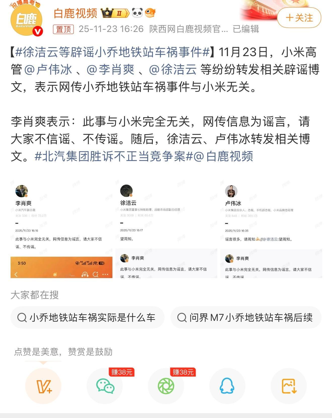 徐洁云等辟谣小乔地铁站车祸事件。这条路我经常走,一到下班点车多的要命,自行车都过不去,确实很容易出现碰车问题。但是也不至于一出现这种情况就把责任嫁货给小米吧?这是什么逻辑?