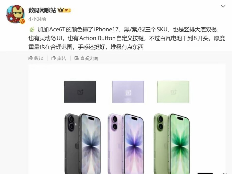 【一加中国区总裁李杰汇总Ace 6T爆料,真机“周一见”】一加中国区总裁李杰对一加 Ace 6T 的配置进行了简单总结,并预告真机周一见。1、定位「性能旗舰新选择」,性能狠 Pro ,续航超 Max ;2、全球首发高通旗舰芯片,第五代骁龙 8Gen5;3、电池容量 8 开头,还兼具 100W 闪充;4、写入新一代「风驰游戏内核」,轻松驾驭 165 超高帧游戏;5、行业领先的 165Hz 极速高刷,玩游戏非常丝滑;6、标配 IP66、IP68、IP69、IP69K 满级防尘防水;7、标配 3D 超声波指纹;8、全新「冰河散热系统」,一加最大散热面积;9、支持《王者荣耀》144FPS 模式;10、行业独家的全新「电竞三芯」;11、标配旁路供电,标配一加 15 同款的陀螺仪;12、还有一个 Ace 6T 原神神里绫华定制机。一加 Ace 6T 手机将于本月发布,全球首发高通骁龙 8 Gen5 处理器,搭载超 8000mAh 电池,支持 165 超高帧游戏。已曝光一加 Ace 6T 手机的配色,据称这台手机将有黑色 / 紫色 / 绿色三种配色可选,撞色苹果 iPhone 17 标准版,也拥有竖排大底双摄、灵动岛 UI,还配备有自定义按键。