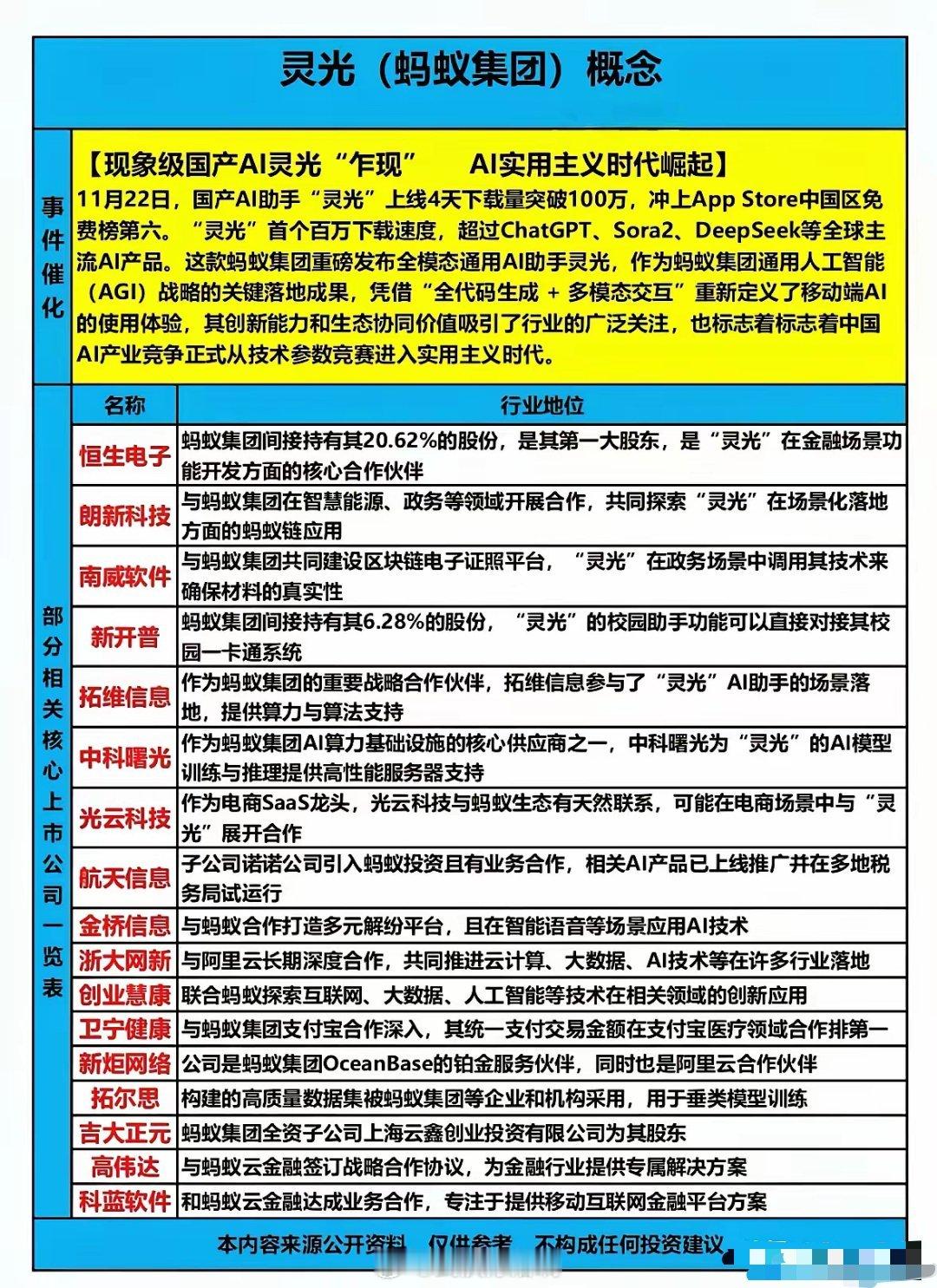 国产AI助手“灵光”引爆实用主义浪潮,生态协同推动产业落地近日,蚂蚁集团推出的全模态通用AI助手“灵光”引发广泛关注。上线仅四天,其下载量便突破100万,跻身应用商店免费榜前列,这一成绩超越了多款国际主流AI产品的初期表现。作为蚂蚁集团在通用人工智能(AGI)战略中的关键落地成果,“灵光”凭借“全代码生成”与“多模态交互”能力,显著优化了移动端AI的用户体验,标志着国内人工智能竞争正从单纯的技术参数比拼,迈入以实用价值为导向的新阶段。在生态协同方面,“灵光”积极与各领域伙伴展开合作。在金融、政务、能源、校园、医疗及电商等多个场景中,均有相关企业参与其功能开发与技术落地,涵盖区块链应用、算力支持、数据服务与系统对接等环节。这种广泛的行业链接,不仅加速了AI技术的场景化渗透,也为其构建了扎实的产业生态基础。从市场情绪与热度来看,“灵光”的快速崛起显著提振了市场对国产AI应用的信心。其表现反映出用户对具备实用功能、能直接赋能工作与生活的AI工具有着强烈需求。就发展潜力而言,背靠蚂蚁集团的资源与技术实力,加之其积极的生态共建策略,“灵光”在推动AI与实体经济深度融合方面前景广阔。未来,随着技术迭代与场景拓容,此类注重实际效用的AI助手有望持续引领行业发展趋势,推动中国AI产业在应用落地的竞争中占据更有利位置。
