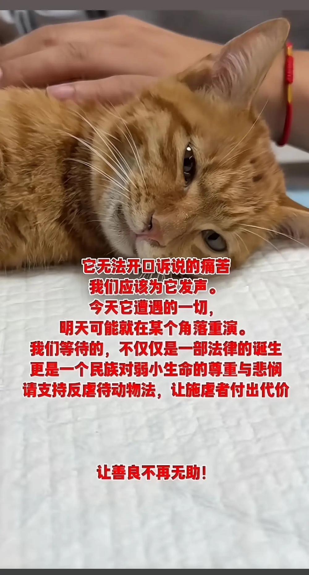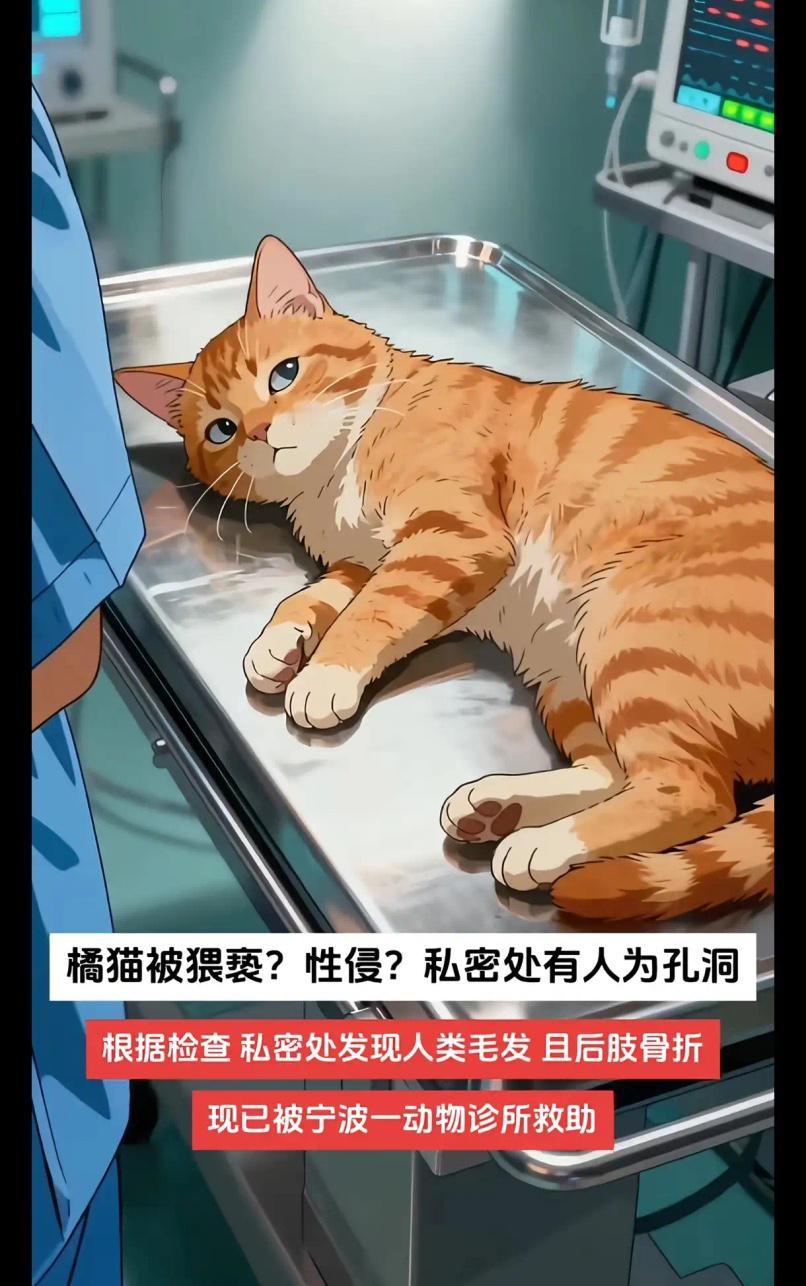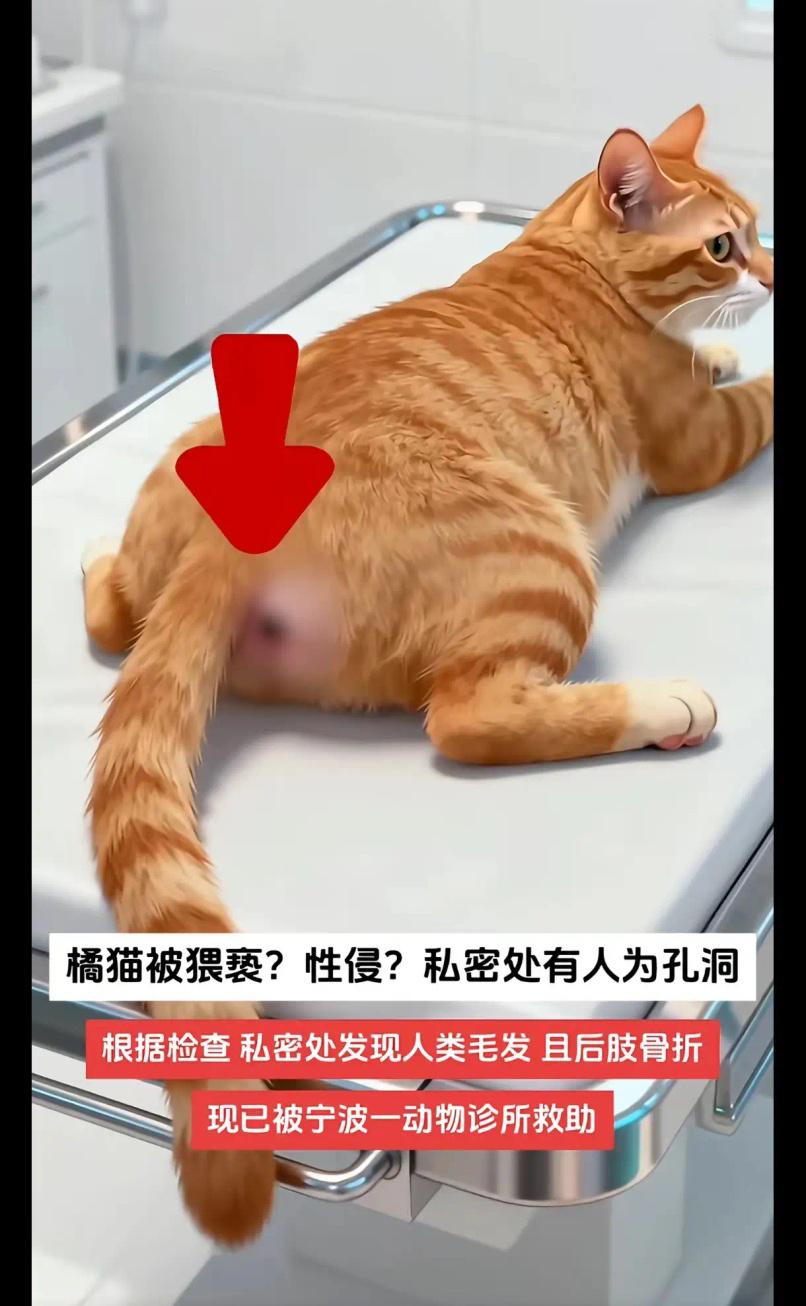 真的是闻所未闻,橘猫被性侵!今天在抖音看到一个让我三观碎一地的事件。宁波一动物救助站救助了一只橘猫,发现猫咪私处有人为的孔洞并在周围存有人体毛发,另外猫咪两侧后腿均为骨折状态。 救助站志愿者发现异常时当场红了眼,抱着猫咪往宠物医院冲的路上,能明显感觉到小家伙浑身发颤,连呼吸都带着微弱的呜咽,碰一下后腿就疼得蜷缩,私处的伤口渗着血丝,沾着脏东西,看着让人揪心到喘不过气。宠物医生拆解检查时语气都沉了下来,说私处孔洞是外力强行造成的撕裂伤,周围残留的人体毛发经初步鉴定为成年男性毛发,两侧后腿胫骨骨折,大概率是钝器击打或暴力拖拽导致,猫咪当时体温偏低,内脏还有轻微挫伤,光是清创缝合就做了两个多小时,术后躺诊疗台角落,全程缩成一团,志愿者伸手想安抚,它只会下意识往后躲,连叫都没力气,养过小动物的都懂,这种对人类的极度恐惧,是被狠狠伤害过才会有的本能反应。 救助站后续调取了猫咪被救前活动的老小区监控,画面虽模糊却能看清关键片段:事发前一天傍晚,一只戴黑色口罩的中年男子蹲在草丛边,把橘猫从里面拽了出来,橘猫挣扎着叫了两声,被他死死按在手里拖进旁边无人小巷,十几分钟后男子独自快步离开,再看橘猫从巷口挪出来时,已经站不稳了,两条后腿拖着地面,一步一挪躲回草丛,直到第二天上午被巡逻的志愿者发现,期间饿了渴了都没法动弹,只能趴在原地等死。监控里男子的身形、离开时的步态已经交给警方,毛发样本也送去做DNA比对,民警也在排查小区及周边常住人员,可救助站志愿者心里没底,毕竟之前也遇到过动物被虐待的情况,大多因为取证难、惩戒力度有限,最后不了了之,这次橘橘(志愿者给猫咪取的名)遭遇的是远超普通虐待的恶行,光是想想施暴者对弱小生命下狠手的模样,就觉得人性扭曲到了极致。 橘橘现在还在宠物医院养伤,每天要打止痛药、消炎药,排尿时因为私处伤口疼,经常憋得浑身发抖,志愿者轮流守着它,喂饭时得小心翼翼托着它的身体,怕碰到骨折的腿,换药时要两个人按住,它疼得爪子攥紧,却不敢再反抗,只有志愿者轻声跟它说话、摸它头顶时,才敢慢慢抬眼蹭蹭手,眼里满是怯生生的依赖。宠物医生说,橘橘的腿至少要三个月才能拆石膏慢慢行走,后续还得做康复训练,而私处的创伤和心理阴影,可能要花更久才能缓解,甚至一辈子都没法完全放下。 最让人愤怒的从来不是“虐待动物”本身,而是施暴者对生命的毫无敬畏——猫咪没有反抗能力,却被人用极端残忍的方式伤害,打断腿、施暴,本质是把自身的扭曲情绪发泄在弱小身上,这种连动物都容不下的人,难保不会把恶意转嫁到人类弱势群体身上,想想都脊背发凉。网友刷到消息后炸开了锅,有人给救助站捐了医药费、猫粮,有人主动提供周边线索,还有律师联系救助站,说愿意免费提供法律援助,大家盼着能尽快抓到施暴者,也希望能借着这件事,让更多人关注动物保护,毕竟守住对弱小生命的恻隐之心,才是守住人性的底线。现在橘橘每天能勉强吃点猫粮,偶尔会趴在窗边看外面,可只要听到陌生人的脚步声,还是会立刻缩回去,它本该是自在穿梭小区的小生命,却因为有人的恶,承受了不该承受的痛苦。各位读者你们怎么看?欢迎在评论区讨论。