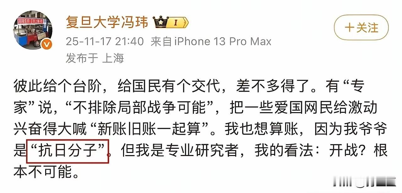 跟本子开战还是不开战,什么时候开战,如何开战那是国家的意志,国家有通盘考虑,作为公民,跟随国家的脚步,支持国家的决定。 作为抗日军属,作为知识分子,作为一个中国人,最基本的是对自己的祖辈有出于生物本能的尊重,这是做人最基本的伦理道理! 最后一句:您口中的抗日分子,我们尊称为抗日英雄,最起码也是抗战老兵!