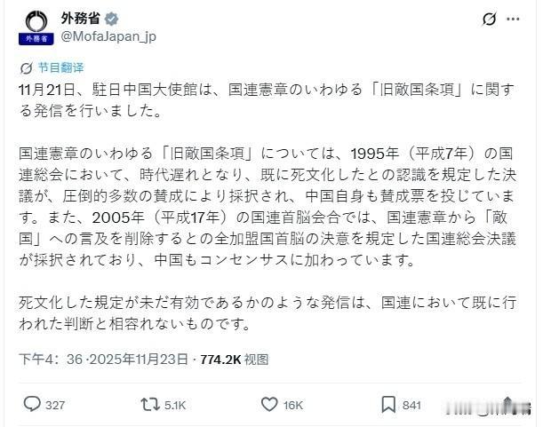 联合国宪章敌国条款未被废除,日本外务省否认敌国条款,意图浑水摸鱼! 11月23号,日本外务省发文称,联合国宪章中的敌国条款已经失效。 真相是: 1995年的联合国大会以155票赞成,3票弃权通过50/52号决议,建议废除敌国条款,称其已过时。但是这项决议仅仅是建议废除,而且过时也并不是废除。 2005年的联合国首脑会议通过的决议同样如此,也仅仅是建议删除,并没有实际删除。 想要修改联合国宪章,需要同时满足两个条件,一是联合国大会三分之二的成员国同意,二是联合国安理会五大常任理事国一致批准。 而中俄在2005年明确表示反对删除敌国条款,因为这是二战胜利成果的法律体现,具有历史正义性和现实必要性。即中俄赞成联合国建议废除敌国条款的决议,但是坚决反对废除敌国条款。 所以,当下日本仅能强调敌国条款过时,但敌国条款未被废除,日本一旦有再次发动侵略战争的迹象,中俄美英法等国仍可以援引敌国条款直接对其进行军事打击。 日本如果不信,可以试试。