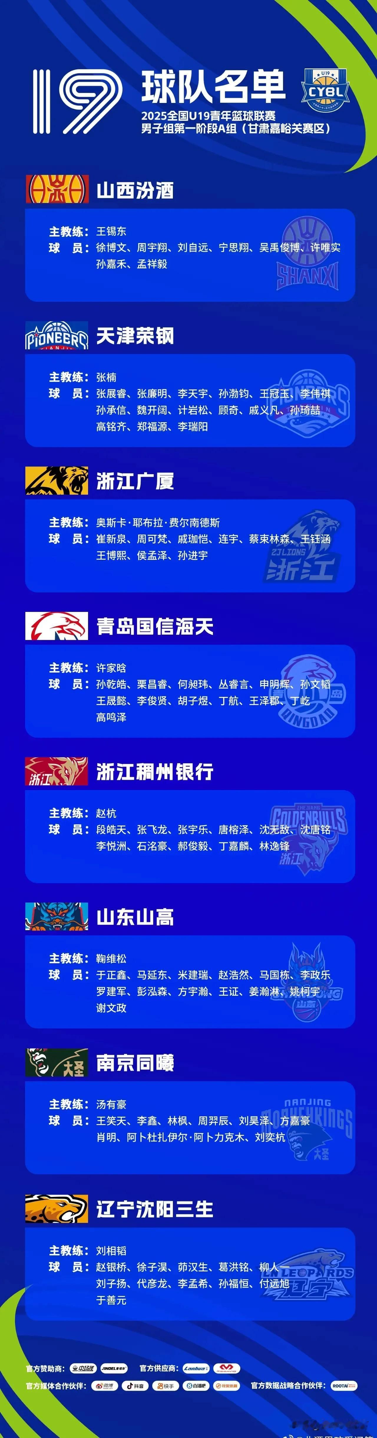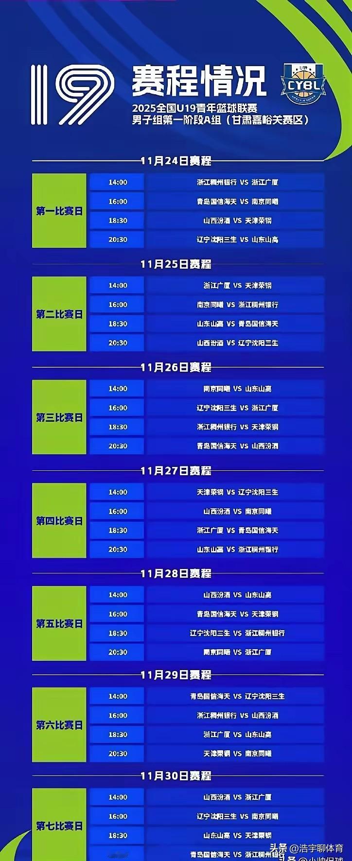 今天开赛,辽青小将再出征,代彦龙,孙福恒领衔,于善元助阵,首战时间及对手确定! 全国男篮u19青年联赛,A2赛区将于11月24日开赛,比赛共分为三个赛区,辽青队被分在了甘肃嘉峪关赛区,同组对手有浙江广厦,山西汾酒,青岛国信,南京同曦,山东高速,浙江稠州,天津荣钢队。 辽青队主教练刘相韬,队员由辽宁一线队球员代彦龙,孙福恒领衔,刚刚参加完全运会u18比赛的于善元,刘子扬助阵,其他球员还有柳人一,赵银桥,付远航等人。 辽青队首场比赛时间为11月24日晚20点,对手正是在今年五月份u21青年联赛与辽宁队发生冲突的山东队。 下面有这个赛区八支球队的具体名单和赛程,球迷朋友可以届时观看。