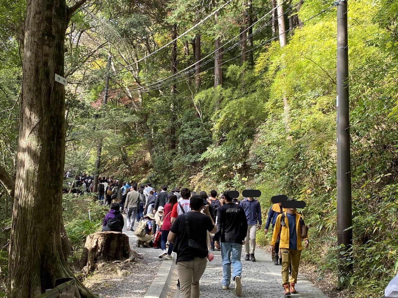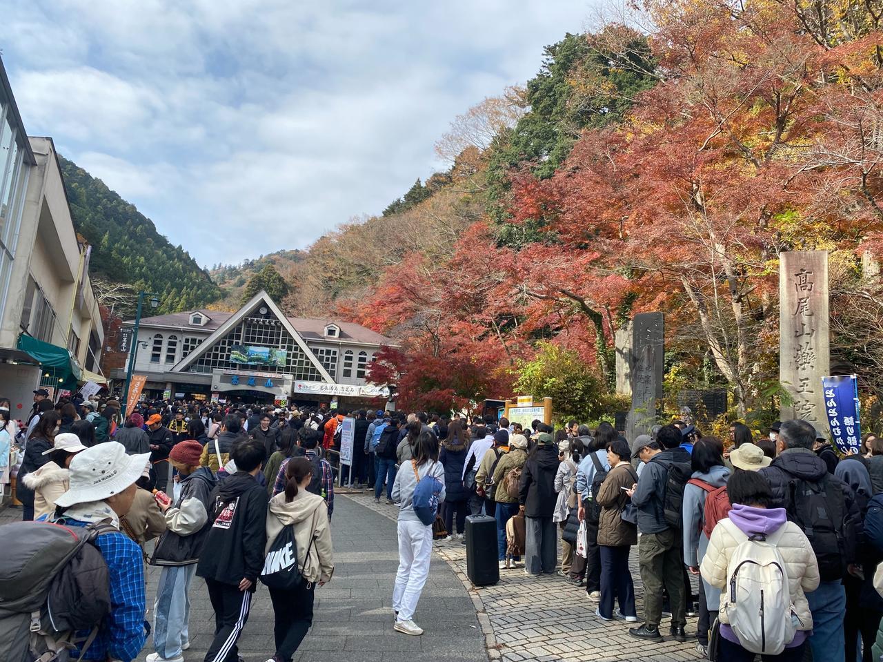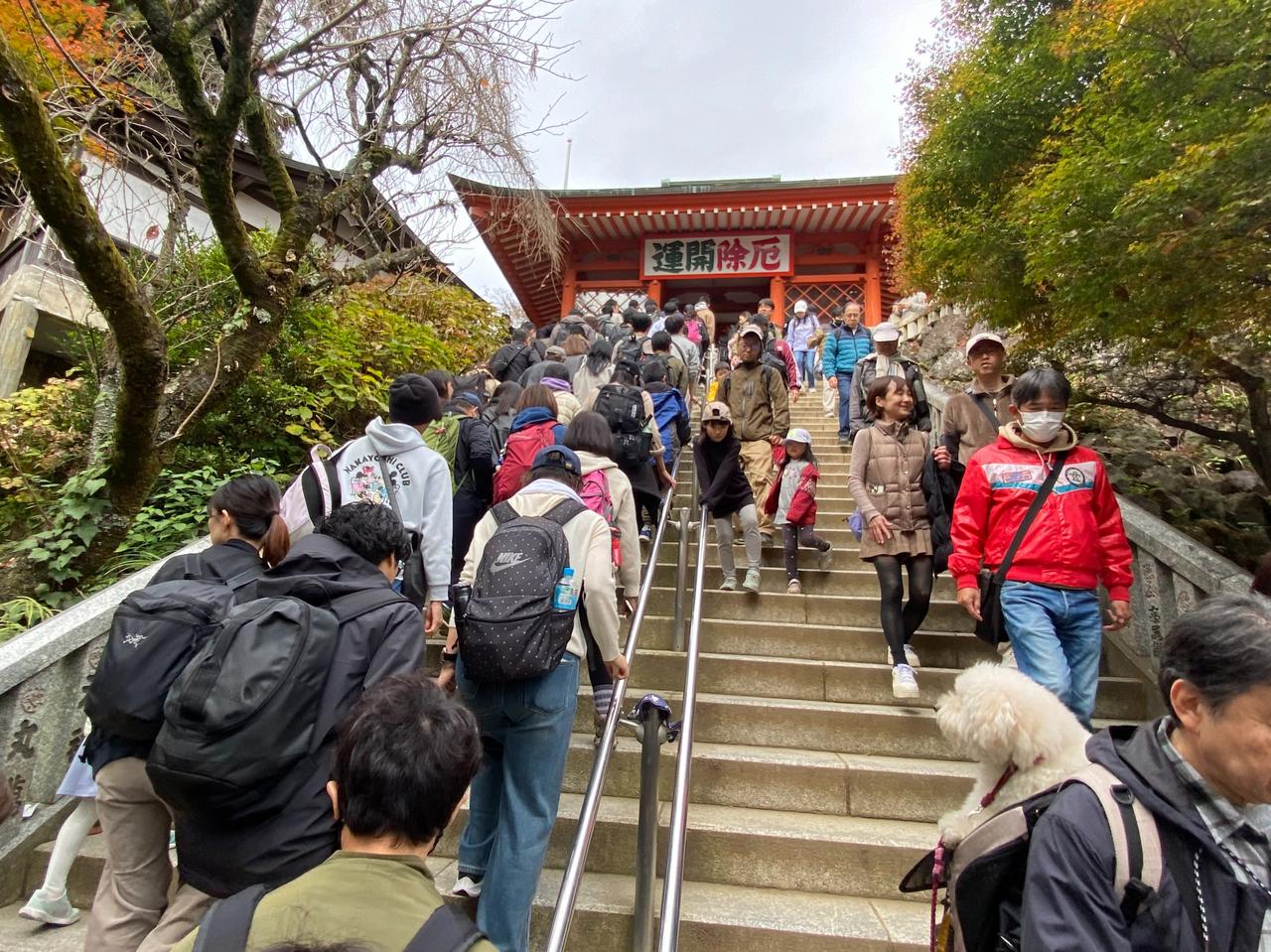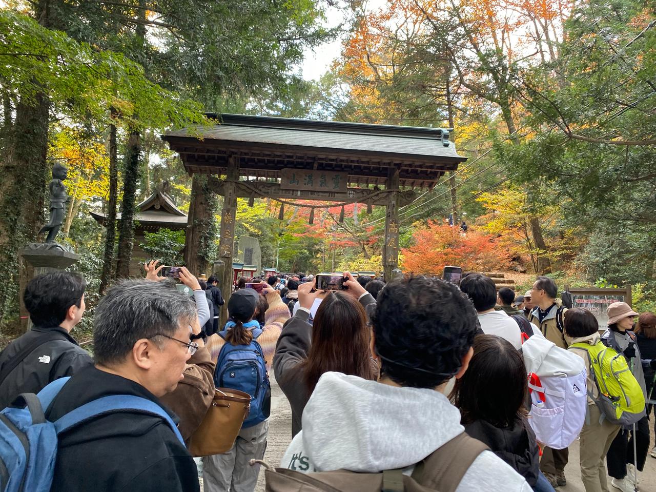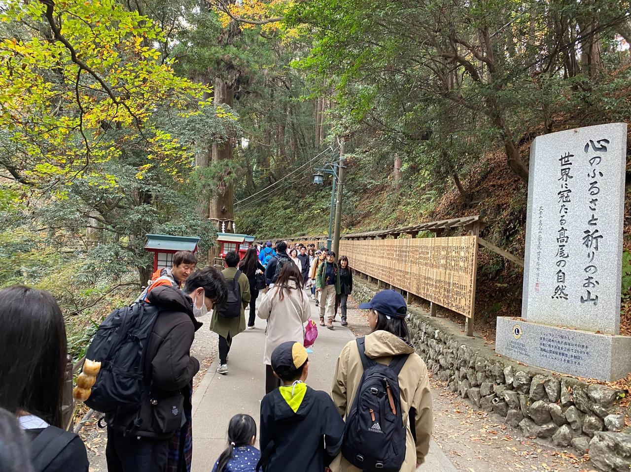 11月23日(周日)三连休的第二天。 一直听东京同事说,以前学校的春游经常组织去的地方就是东京都内八王子是的高尾山,趁三连休天气不错,就去了高尾山[可爱] ***先说游完后的感受: 1.     周末、节日不宜,人太多。 2.     山上没有网络信号。 3.     厕所太少,接近山顶有比较大的厕所。 4.     人多,吃饭的地方少,没见到山上有便利店,建议随身备巧克力之类的东西。 5.     因为人多时,电子支付信号不通,建议随身备现钞。 当坐京王线到高尾山口终点,看到7/11门口排大队,就觉得有点不妙[捂脸]随着人流开始进山后,看到登山缆车排着望不到尽头的队,就直接放弃了,开始徒步登山[笑哭] 途中听后面的日本人聊天,说今年的人比去年多。等到达途中缆车的终点站时,就知道刚才爬上来的距离是毫无意义的,绝对是应该坐缆车的,但今天是无法选择的[衰]看缆车终点的提示板:坐缆车上山后,登顶的时间预估是45分钟[呲牙] 从缆车终点开始登山可能是登高尾山的真正意义,总的感觉高尾山更像个祈求去除厄运、祈求好运的地方[谢谢][撒花] 作为东京都内的一个比较有名的地方,值得一游[赞]就是有点远。在这个三连休,在没坐缆车的情况下,爬山单程要2个多小时左右,蛮辛苦的[憨笑]