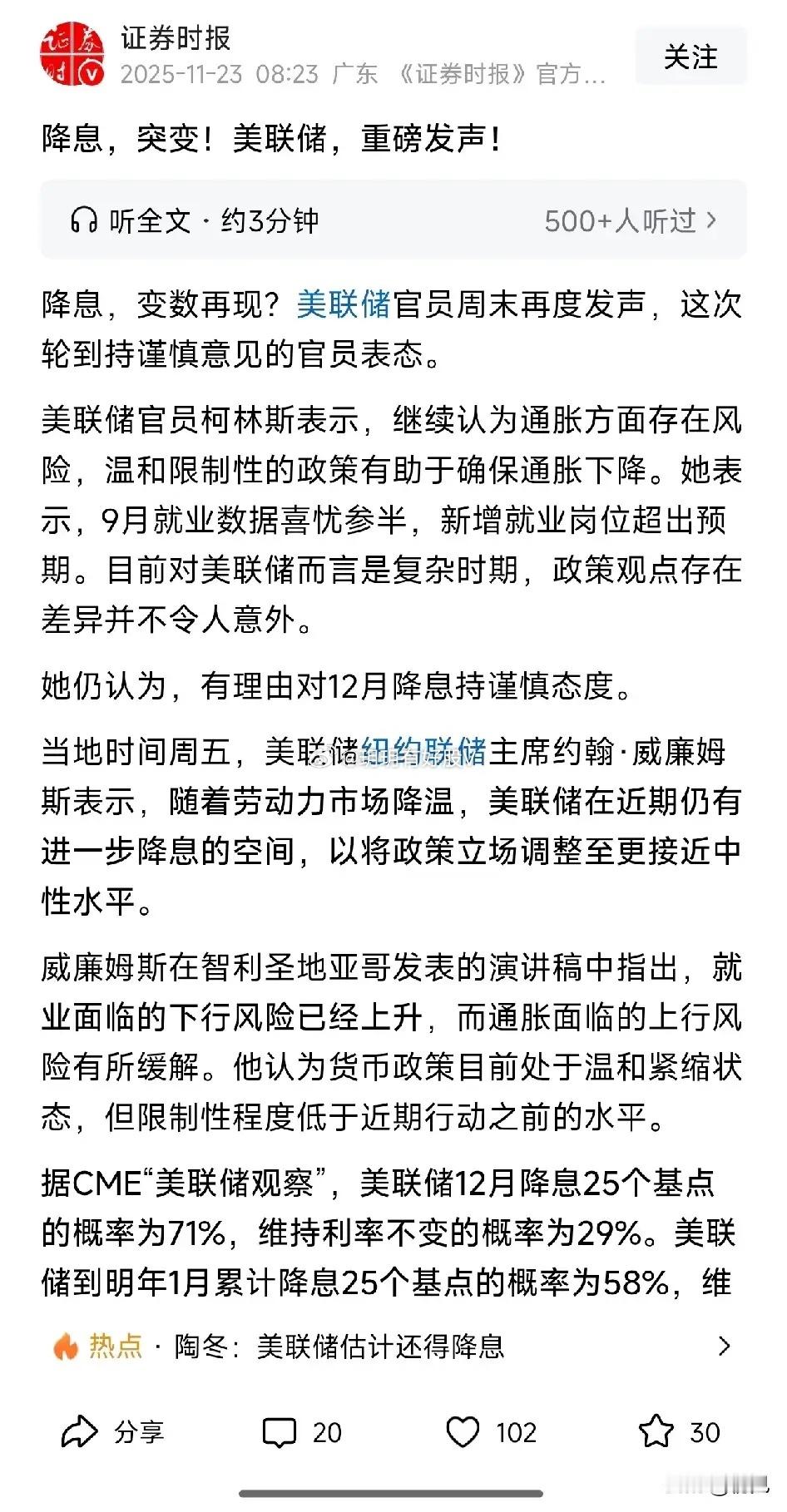降息,突变!美联储,重磅发声!来自《证券时报》的报道,核心聚焦美联储12月降息预