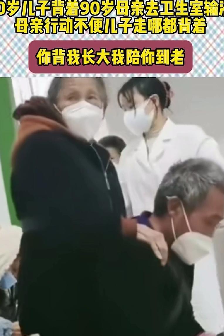 70岁儿子背着90岁母亲去卫生室输液,儿子走哪都背着,儿子已是满头白发的老人,还有一个老母亲需要照顾,儿子每天无微无至照看母亲,那怕一个小小的感冒,儿子也要背起母亲去输液,小时候也曾这样被母亲背过,角色的替还,“演绎”出你背我长大,我陪你变老的真情一幕! 70岁还有妈叫是很自豪的事,只要有妈在,不管儿子有多大,在妈眼里永远是孩子,如果哪天妈不在了,这世上真正,疼你、爱你、牵挂你的人再也没有了!