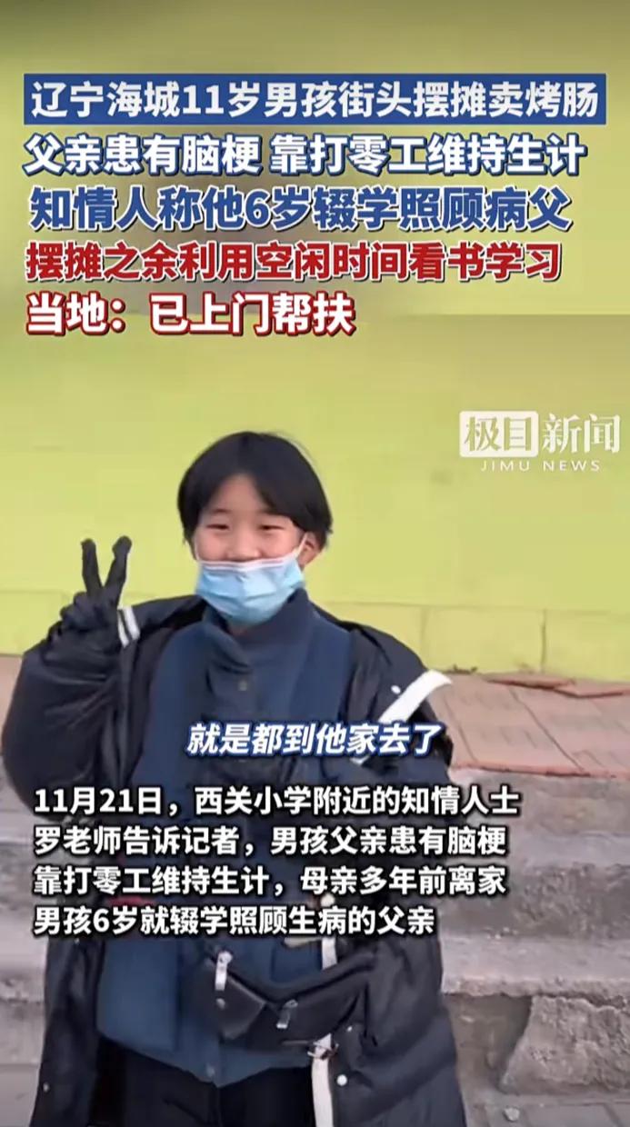 近日,辽宁海城。一名11岁男孩卖烤肠照顾脑梗父亲,知情人称他6岁辍学 摆摊补贴家用。目前,当地部门已上门帮扶 解决其学习和生活问题。 这事被网友拍下发到网上后,好多人都看哭了。大家想想,咱们11岁的时候,还在爸妈怀里撒娇,放学回家有热乎饭吃,可这孩子呢?每天下午都得推着小推车,在西关小学附近支起烤肠摊,一边烤肠一边还要留意路过的行人。他那烤肠机不大,却得撑起一个家——爸爸得了脑梗,干不了重活,只能偶尔打打零工,妈妈多年前就离开了,6岁的他就这么辍学,学着给爸爸做饭、喂药,现在还要摆摊赚钱。 有附近的居民说,这孩子特别懂事,每天出摊前都会把爸爸安顿好,烤肠的时候动作特别熟练,客人扫码付钱他也能有条不紊地找零。别看他年纪小,心里跟明镜似的,知道每一分钱都得花在刀刃上,给自己买根烤肠都舍不得。更让人揪心的是,他摆摊的间隙,总会从怀里掏出本书来看,那书边角都磨旧了,他却看得格外认真。 好在这事曝光后,当地立马行动起来了。海城市委宣传部的人带着两个学校的校长上门,说要解决孩子的学习和生活问题。网友们悬着的心也稍微放下点,有人说“这孩子太不容易了,好在有好心人帮衬”,也有人问“怎么早没发现呢,还有多少这样的孩子”。 这时候就不得不说,互联网在这事里真是立了大功。要不是有人把孩子摆摊的视频传到网上,可能他还得继续一边照顾父亲一边摆摊,他的难处不知道要藏到什么时候。互联网就像一双能看透角落的眼睛,把那些原本被忽略的苦难揪出来,让更多人看到,然后引来帮扶的力量。咱们多希望,能有更多这样的个例被及时发现,不管是像这孩子一样的困境家庭,还是其他需要帮助的人,都能通过互联网的传播,早早得到援手。 说真的,这孩子的坚强让人佩服,但反过来想想,一个11岁的孩子本该在学校里读书、和同学玩耍,却过早地扛起了生活的重担,这背后是多少无奈。咱们总说“少年强则国强”,可少年的强不该是这样被逼出来的。好在现在有了帮扶,希望他能尽快回到校园,补上那些落下的功课,也能像其他孩子一样,有个无忧无虑的童年。 同时也得想想,怎么能建立更完善的机制,早点发现这些需要帮助的家庭,别让孩子小小年纪就这么辛苦。而互联网,就该在其中发挥更大的作用,成为连接苦难与援手的桥梁,让每一个需要帮助的人都能被看见、被帮助。 各位读者你们怎么看?欢迎在评论区讨论。