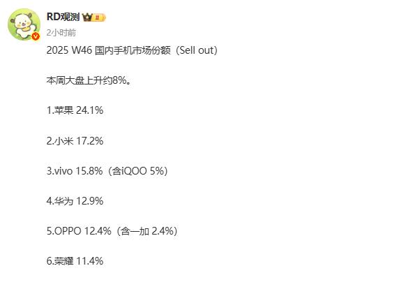 国内第46周手机份额榜出炉,苹果稳居第一但份额微降,小米保持第二。华为这周超越OPPO冲到第四,看来新机发布带动了市场热度。vivo和荣耀份额略有波动,整体市场销量回升了8%。