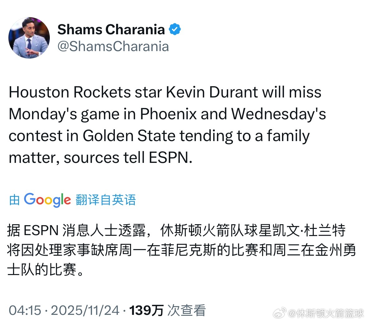 休斯顿火箭队球星凯文·杜兰特将因处理家事缺席周二在菲尼克斯的比赛和周四在金州勇士队的比赛。