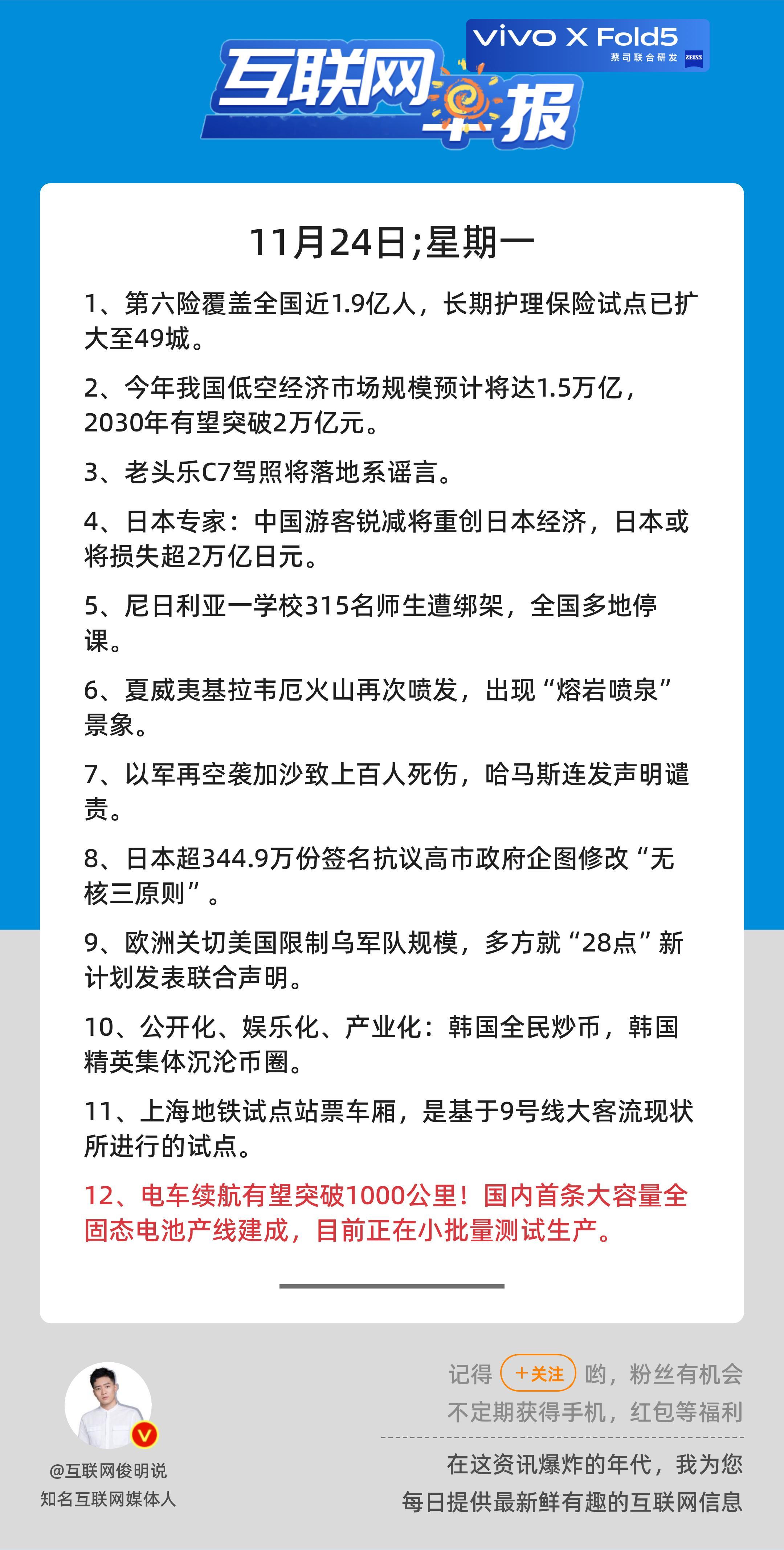 11月24日,星期一,《第2967期》;关心第12条:电车续航有望突破1000公里!国内首条大容量全固态电池产线建成,目前正在小批量测试生产;早安————————————点击右上方关注每天一分钟众览天下事,互联网早报值得拥有! 更多精彩,欢迎加入粉丝群
