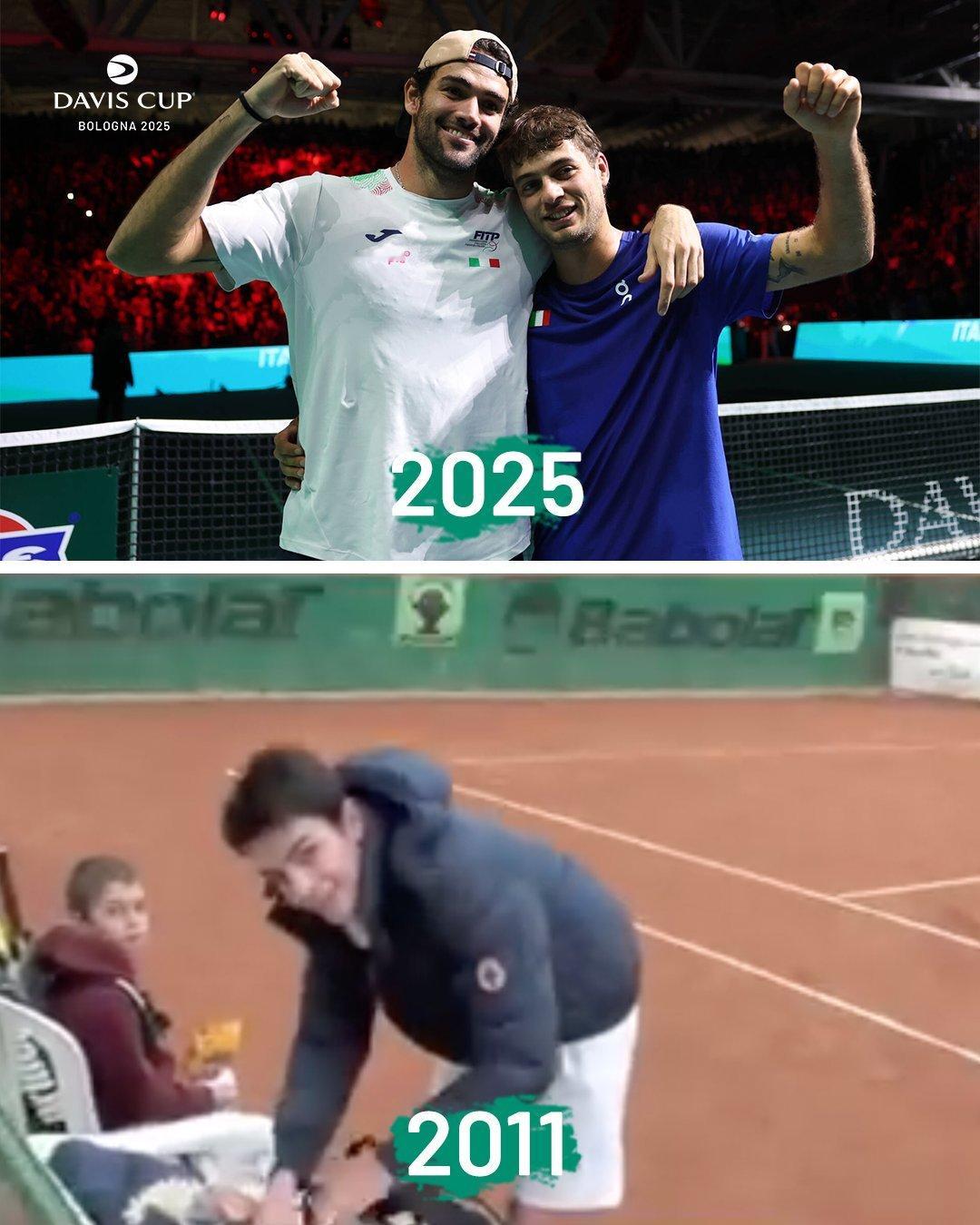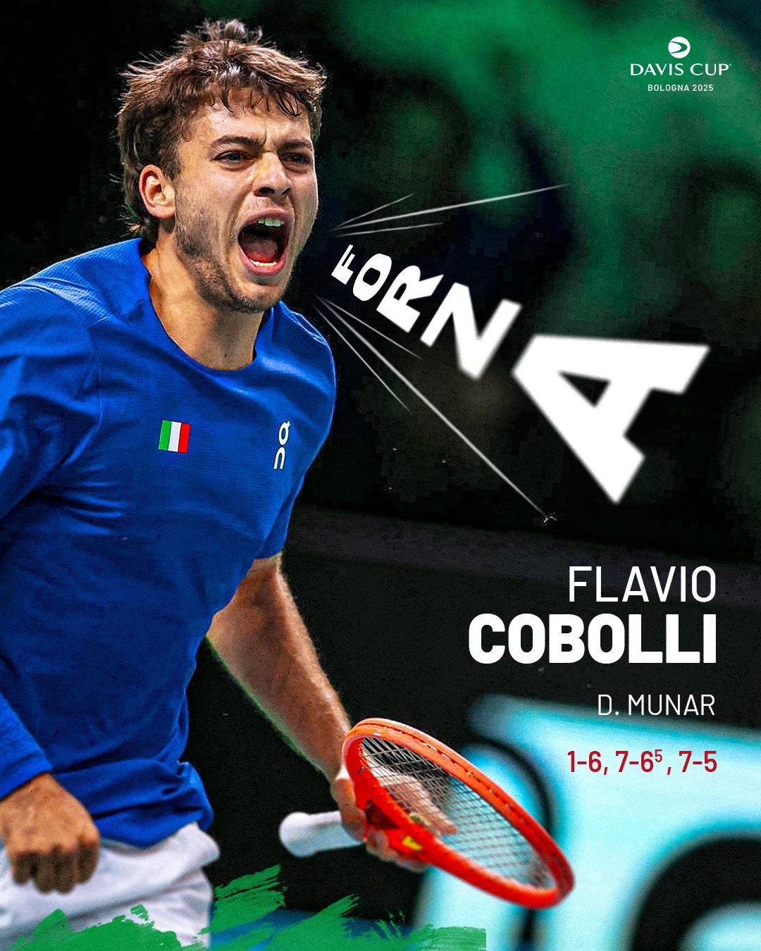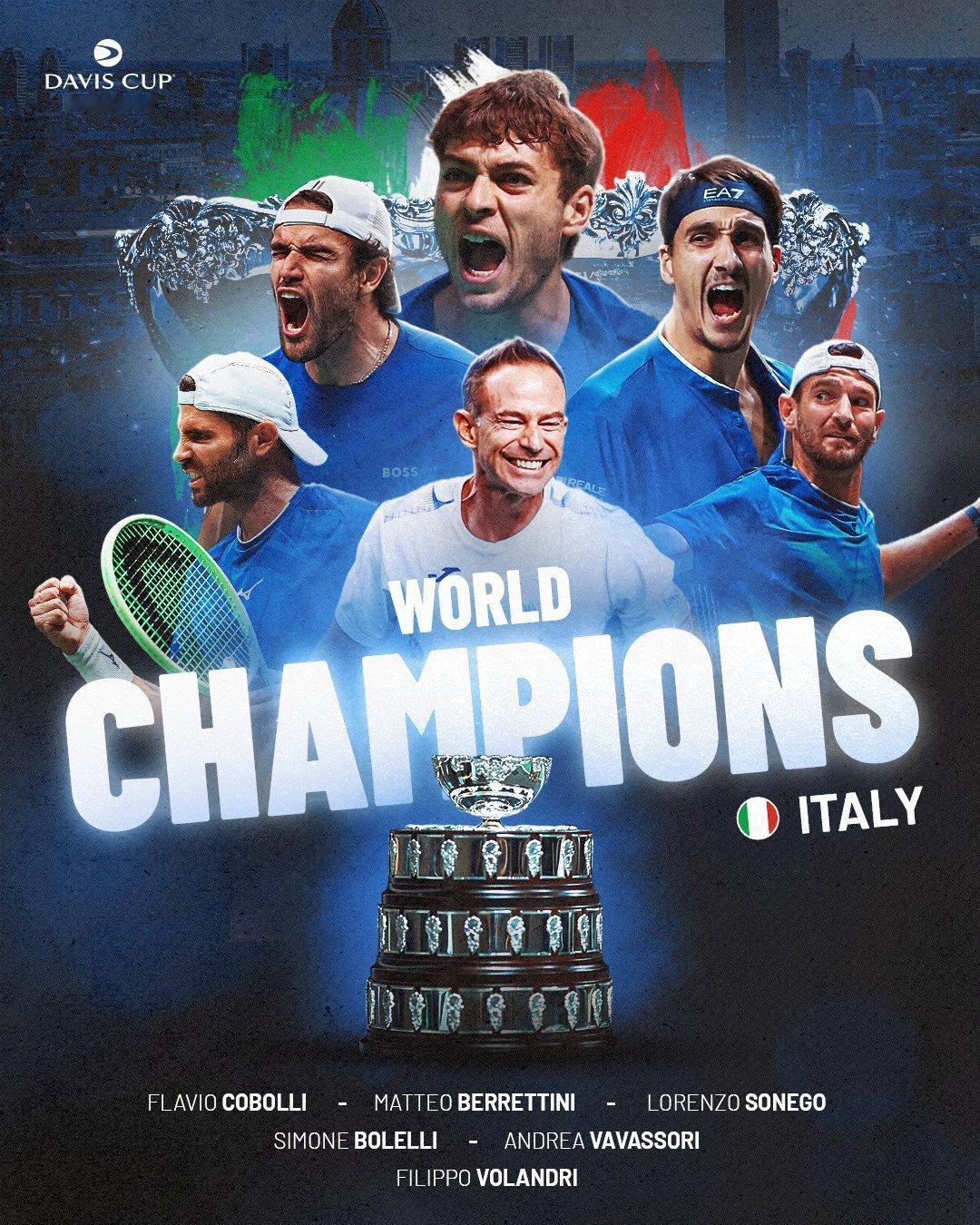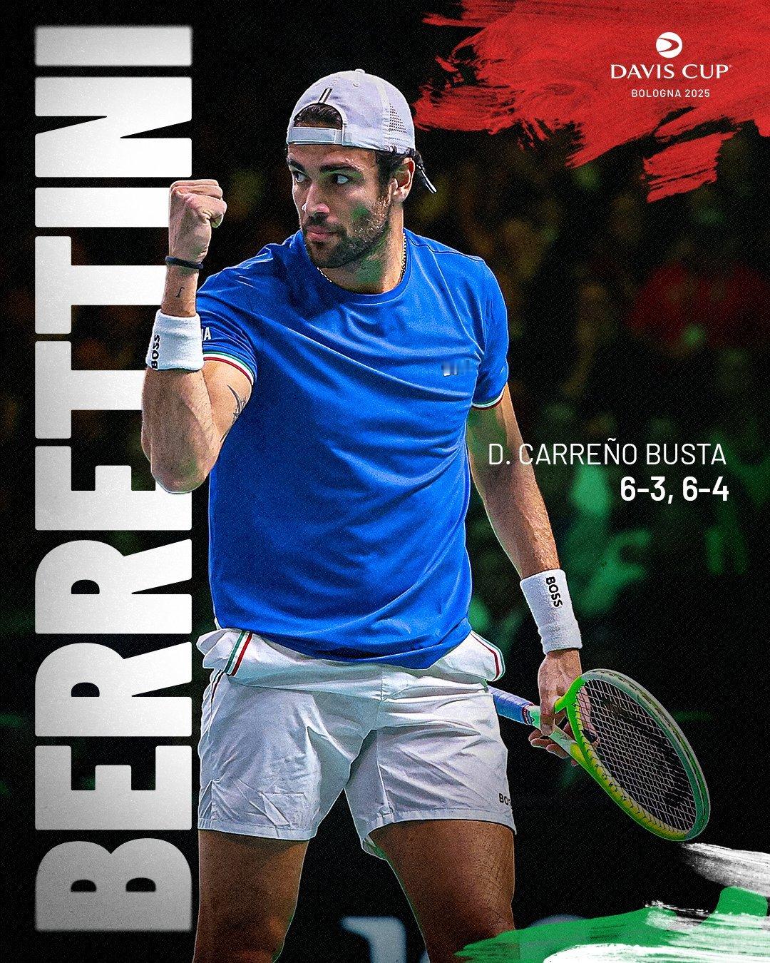 总决赛决赛:🇮🇹意大利队2-0西班牙队🇪🇸成为自1971年美国队之后首支实现三连冠霸业的队伍🏆🏆🏆贝雷蒂尼6-3/6-4布斯塔科博利1-6/7-6(5)/7-5穆纳尔