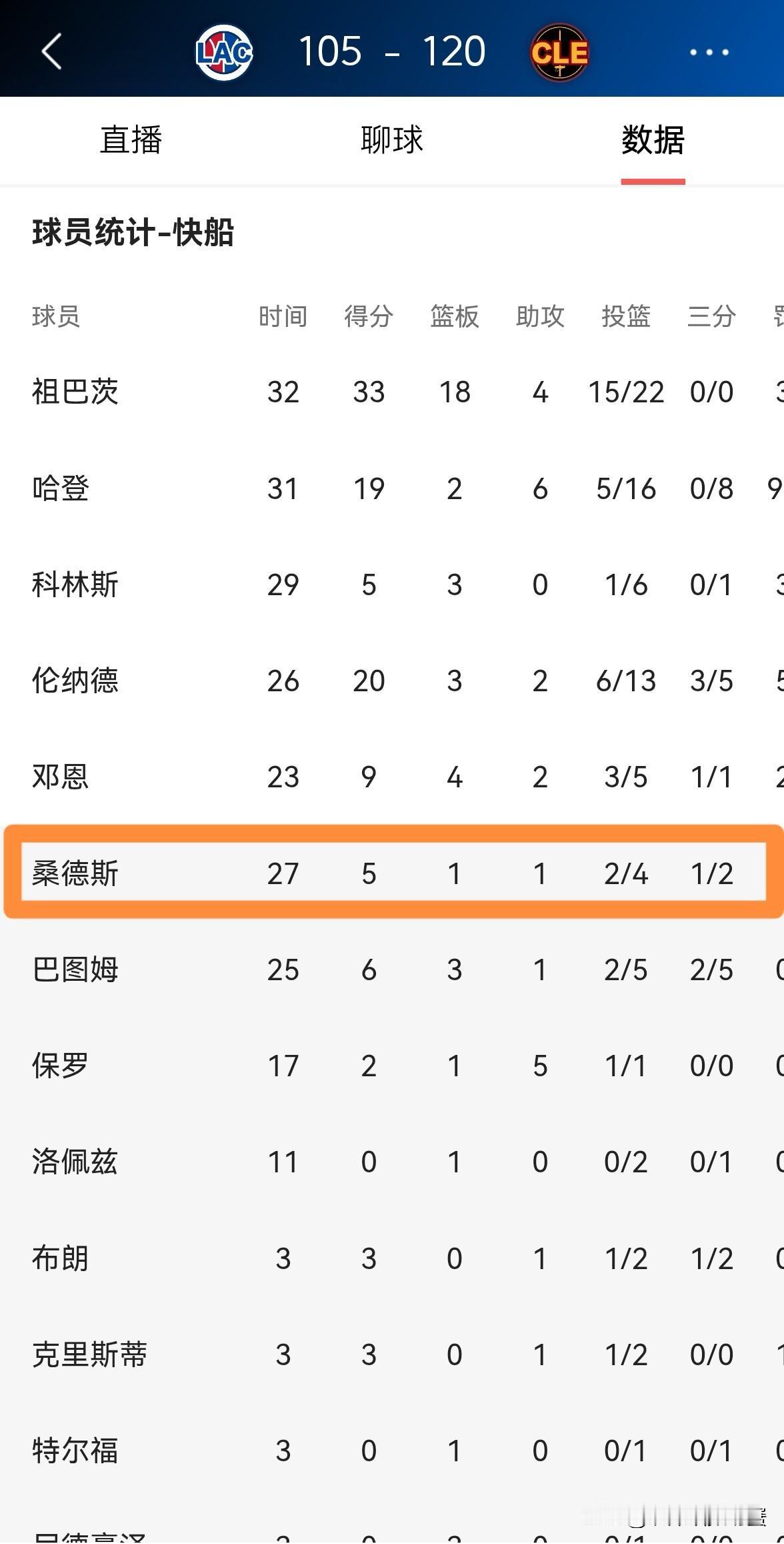快船小将桑德斯真是太悲催了!在今天快船客场以105:120输给骑士的比赛中,桑德斯在防守端被骑士球员疯狂的针对,他俨然成为了对手的提款机。 全场比赛下来,桑德斯替补出战27分钟,投篮4中2,其中三分球2中1得到5分,不过他的场上正负值为-16。 虽然本场比赛桑德斯在防守端打得非常积极,但是由于身体条件受限,他遭到了米切尔、亨特、加兰的暴揍。