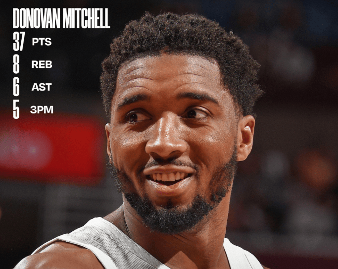 本场比赛,骑士球员多诺万-米切尔出战32分钟,22投14中,其中三分球9投5中,罚球4投4中,得到37分8篮板6助攻1抢断。