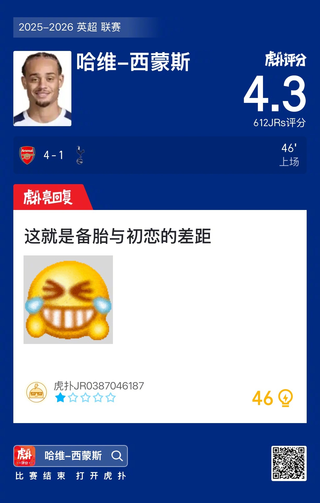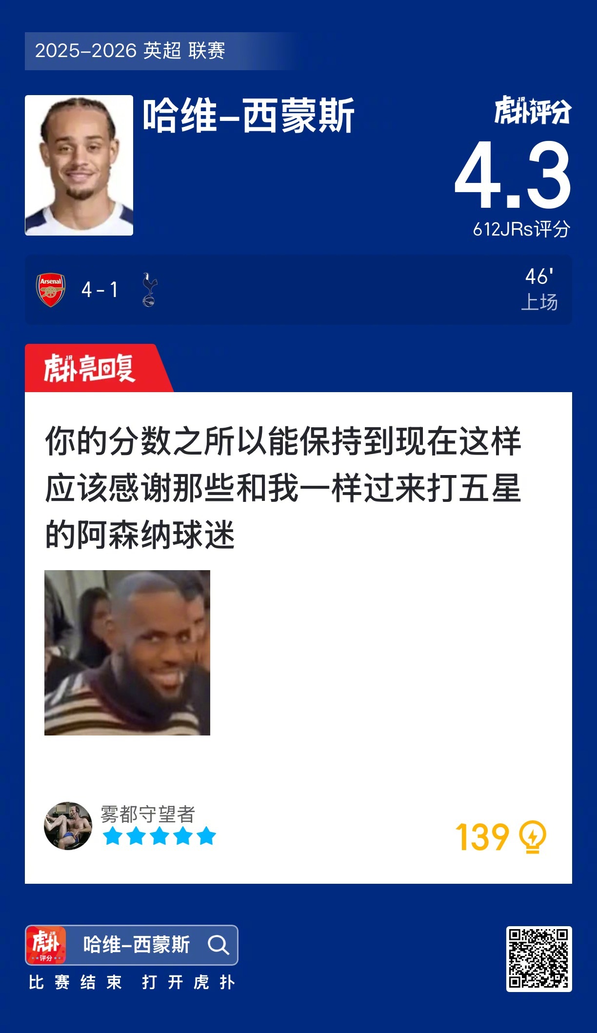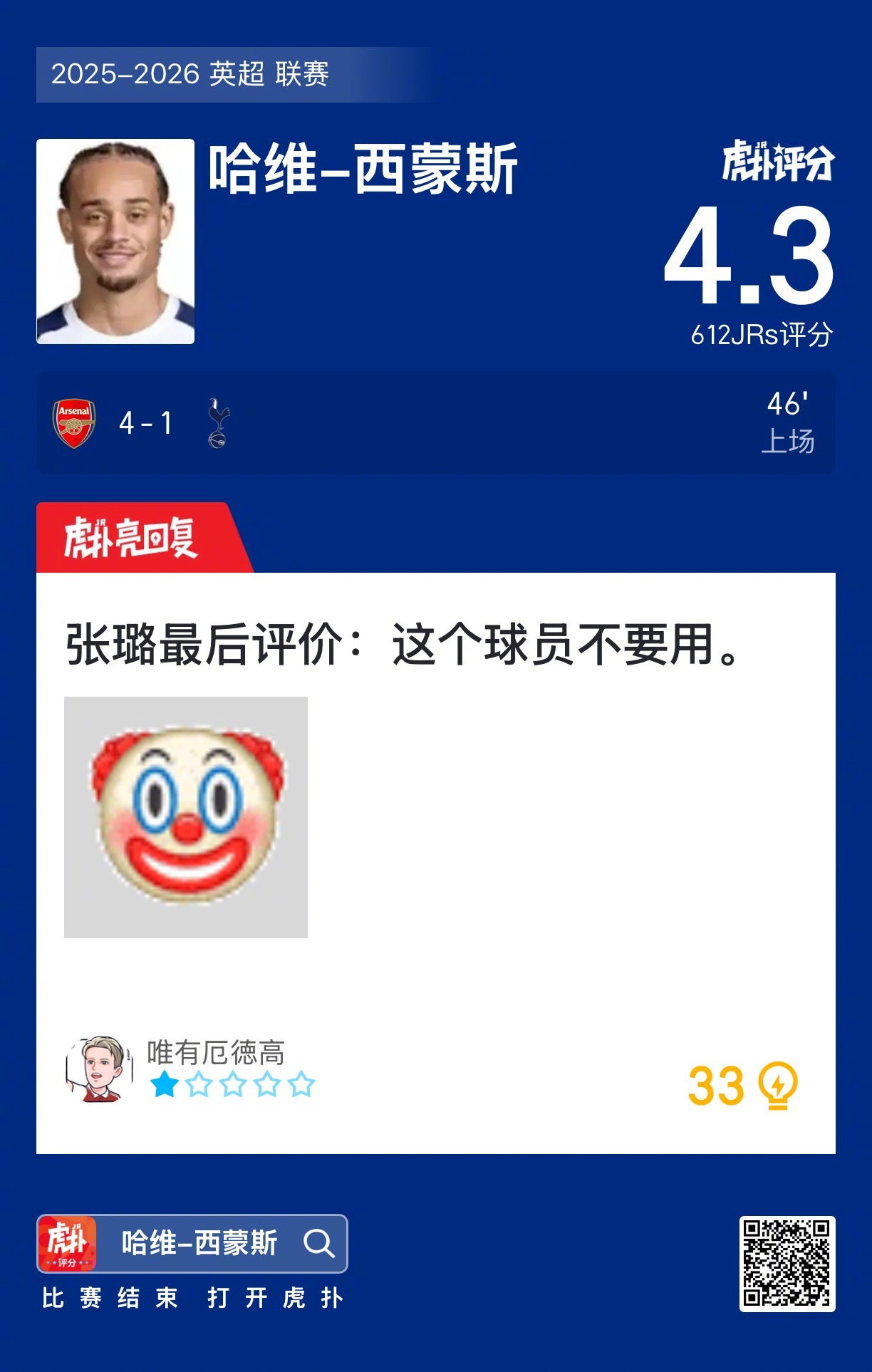 哈维-西蒙斯赛后收获4.3的虎扑评分!