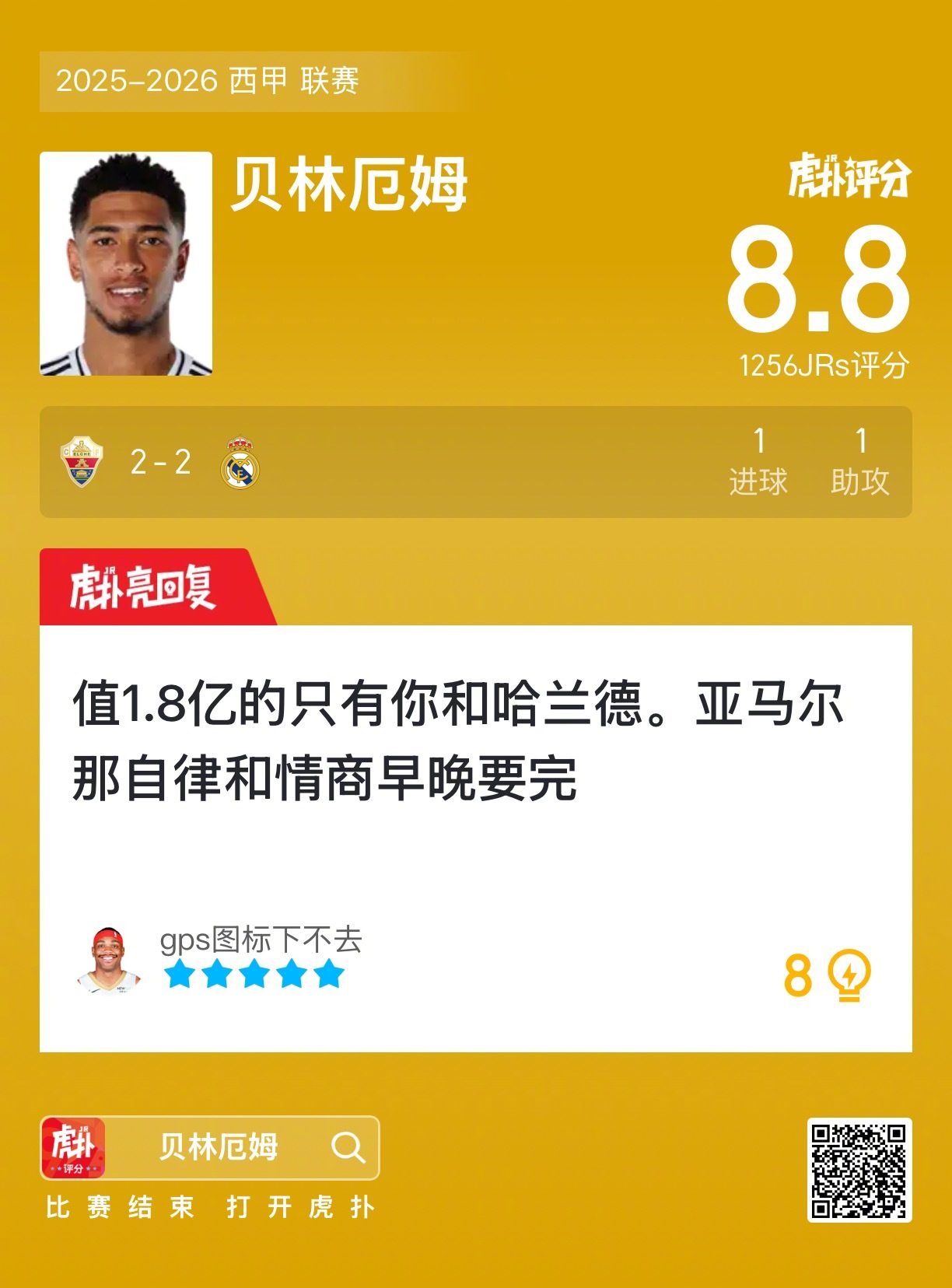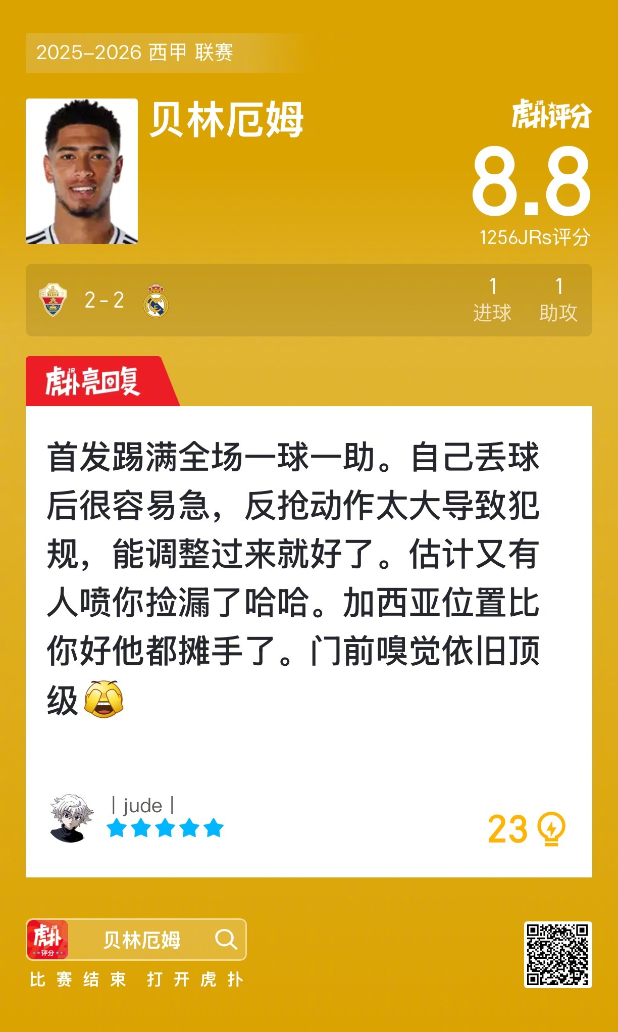 贝林厄姆打进一球,贡献一次助攻,赛后收获8.8的虎扑评分!