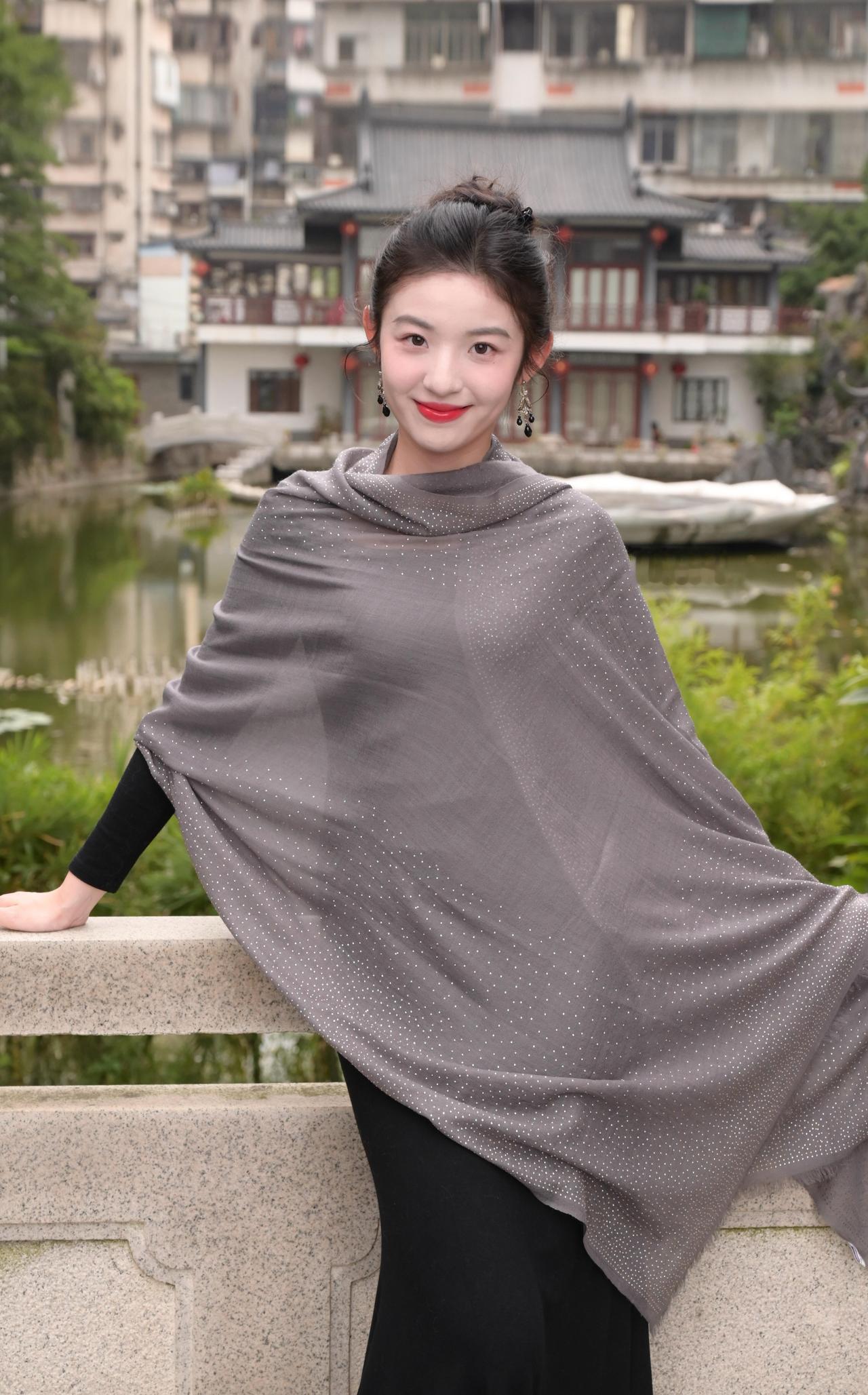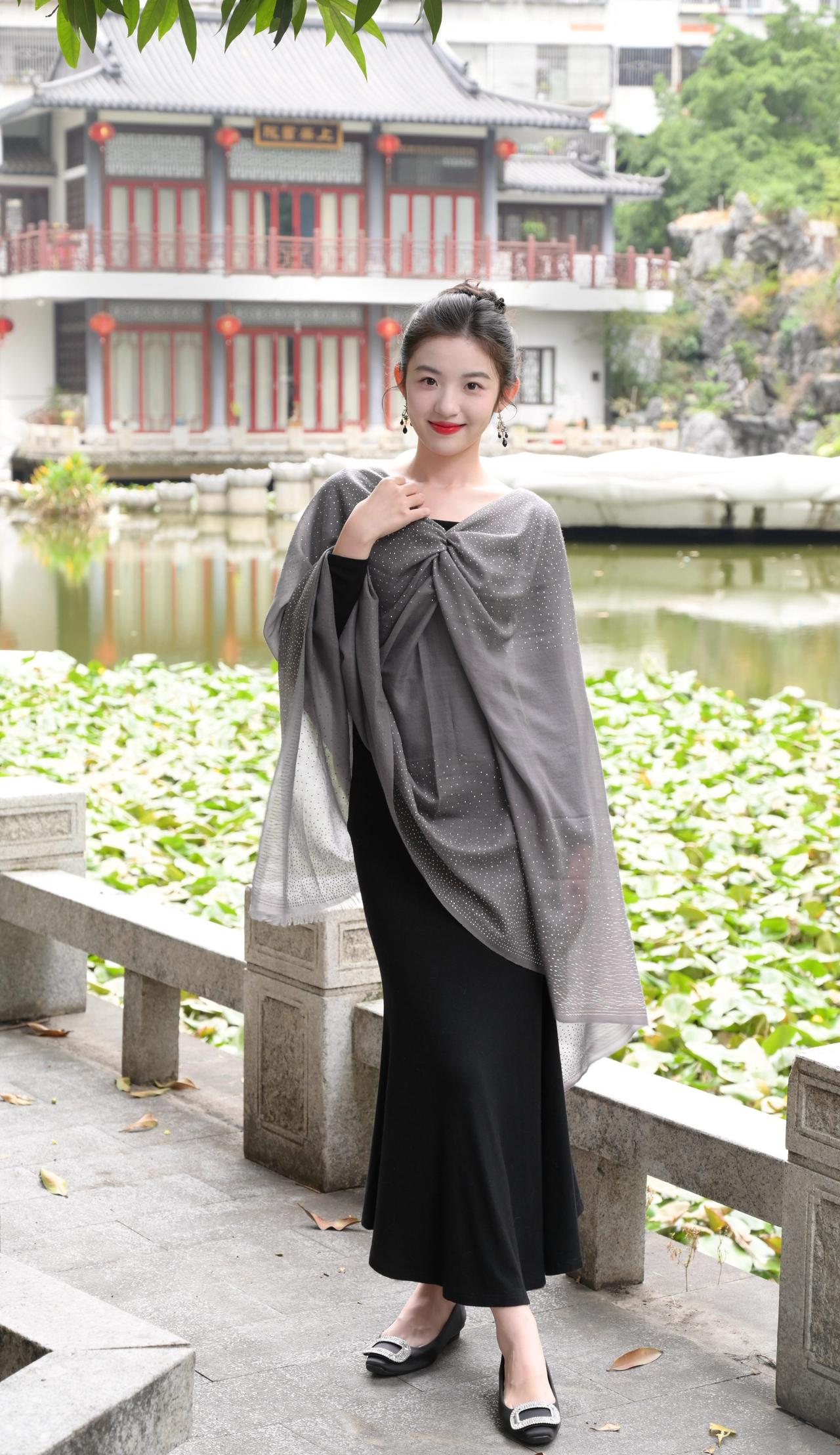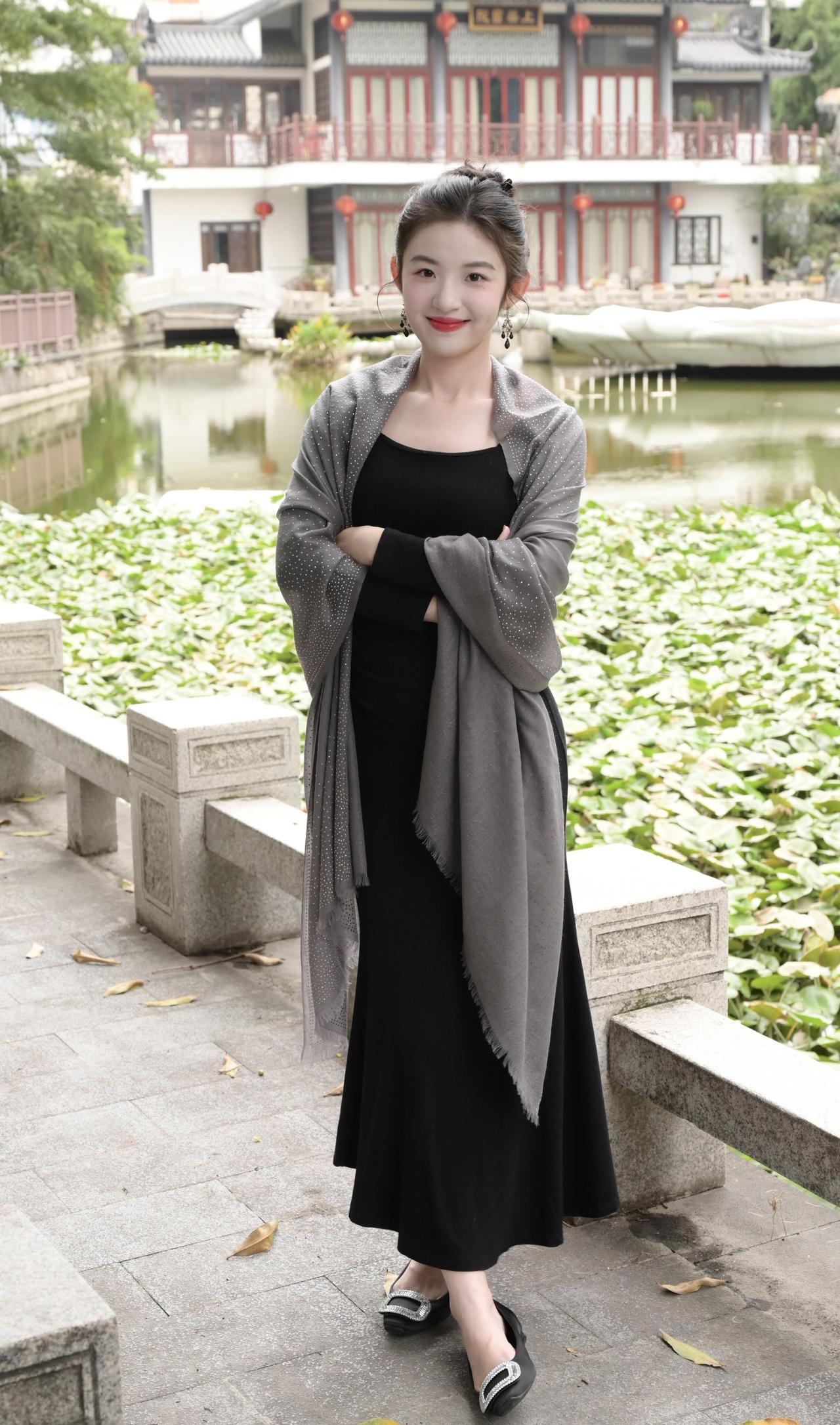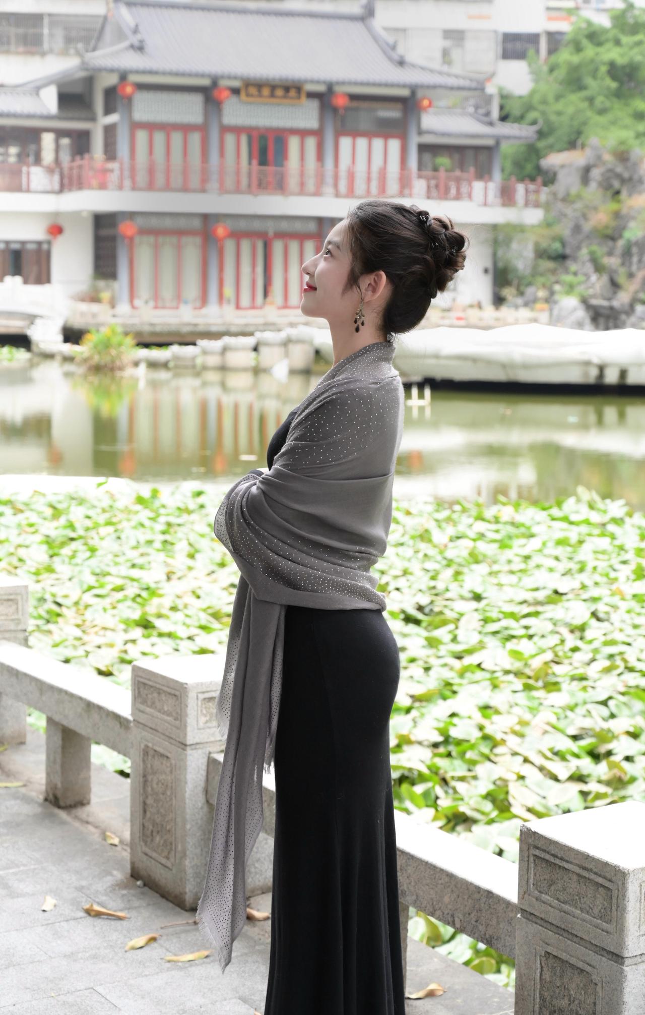 他们说看起来像仙女,真的吗? = = = = = = = = = = = = = = = = = = = = = = 【秋日氛围感拍照指南】 灰色披肩+中式园林简直是氛围感天花板: ①姿势篇:侧身望远/倚栏回眸/手搭肩头,自然松弛不僵硬; ②构图篇:背景选古建筑+荷塘,青石栏杆当天然道具,坐站结合出片率up; ③细节控:披肩带点闪钻绝绝子,红唇+盘发适配度100%,落叶点缀地面更添秋意。