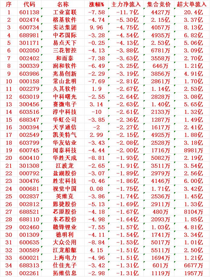 11月24日开盘45分钟,主力资金“卖出的 ”35名单! 工业富联:净流入为 -11.7 亿元 榕基软件:净流入为 -5.30 亿元 实达集团:净流入为 -4.75 亿元 中芯国际:净流入为 -4.54 亿元 易点天下:净流入为 -4.13 亿元