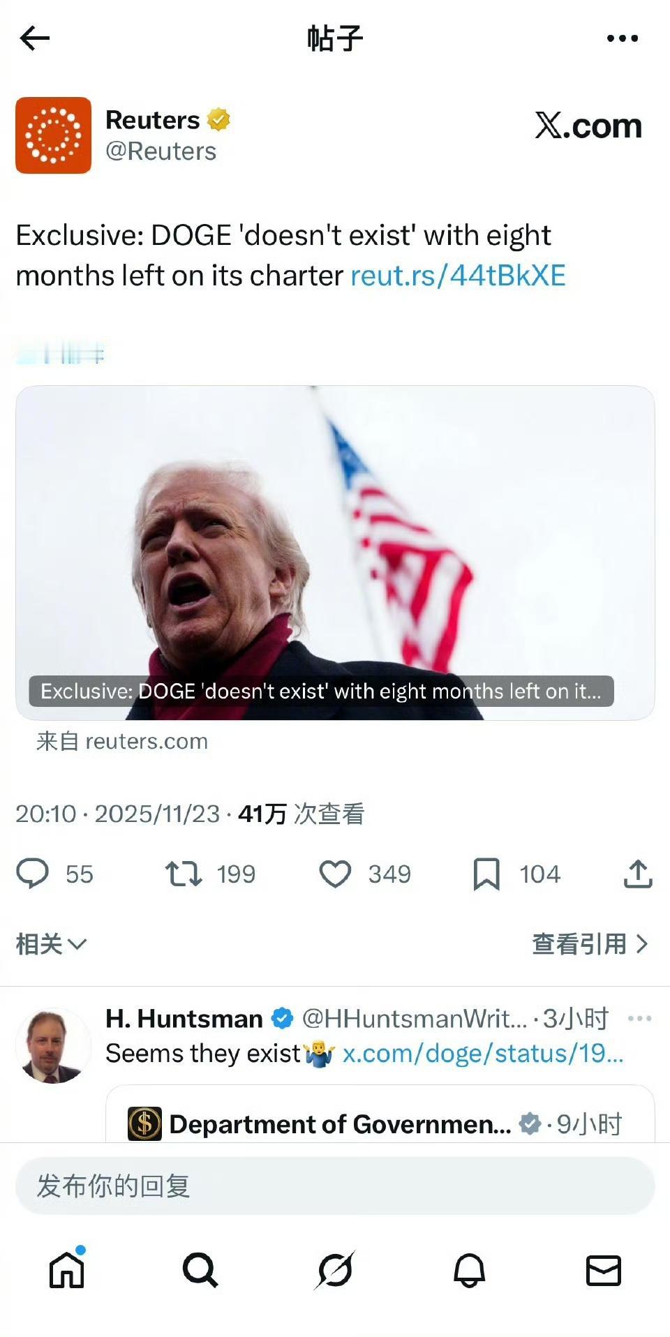 12小时前,路透社:政府效率部已经提前八个月解散。而9小时前,政府效率部前还在发帖。 DOGE不复存在。这个川普和马斯克共同设立的成本削减办公室提前八个月解散,并被美国人事管理局 (OPM) 吸收。 政府效率部 (DOGE) 的设立初衷是精简浪费的项目并改革联邦支出,但人事管理局局长斯科特·库珀现在却表示,它作为一个独立实体“已经不存在了”。 真相就是人类世界不需要提效,不过你就说效率高不高吧?