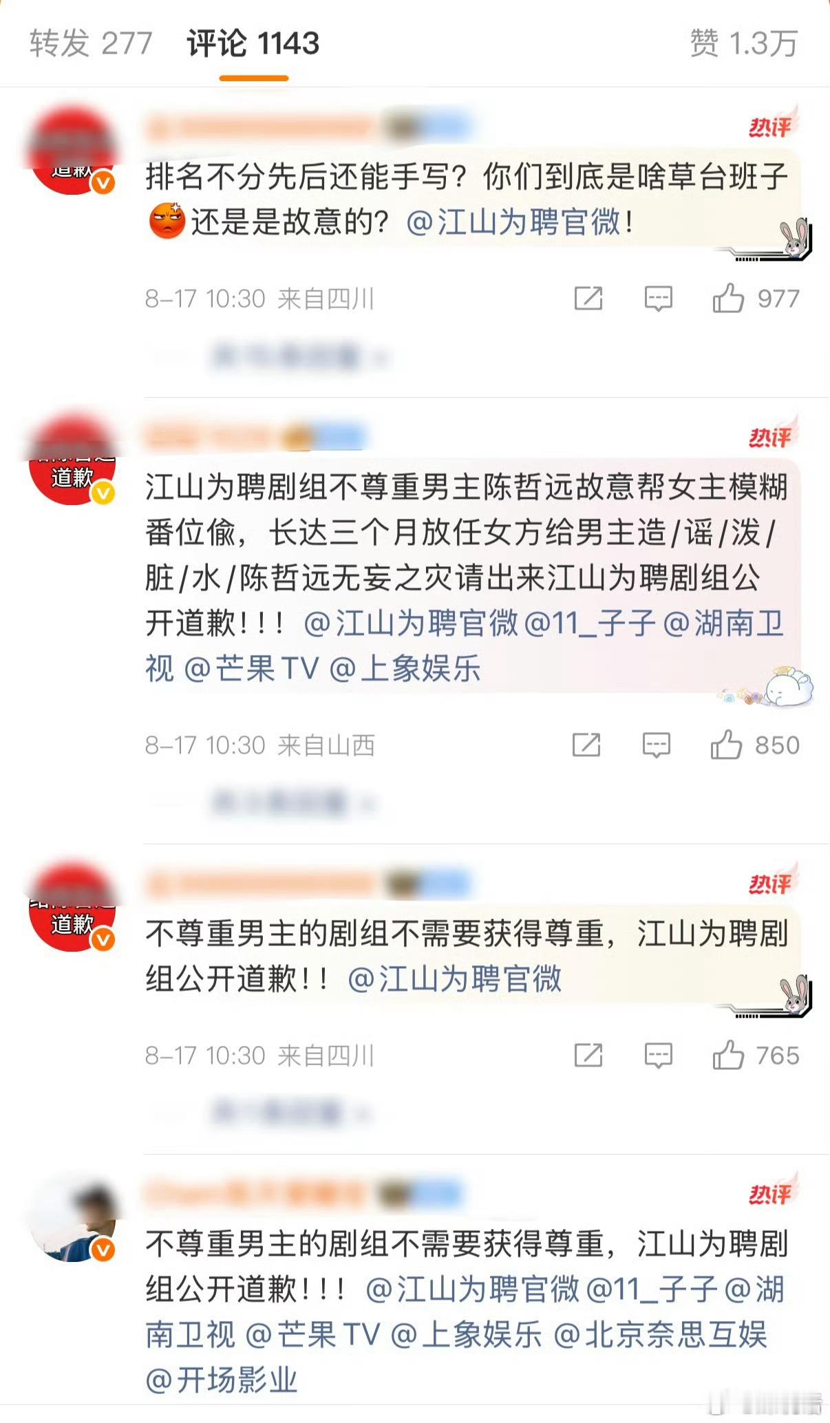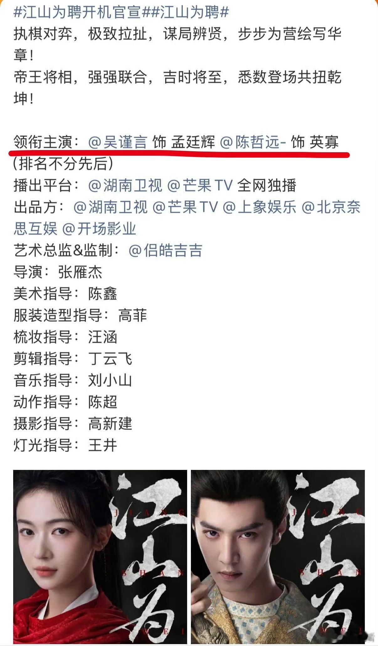 《江山为聘》从开机日起就因为名字顺序问题争议不断,于正更是多次下场讽刺陈哲远,陈哲远粉丝杀青应援物还是柚子叶……感觉不用播了,可以抬走了
