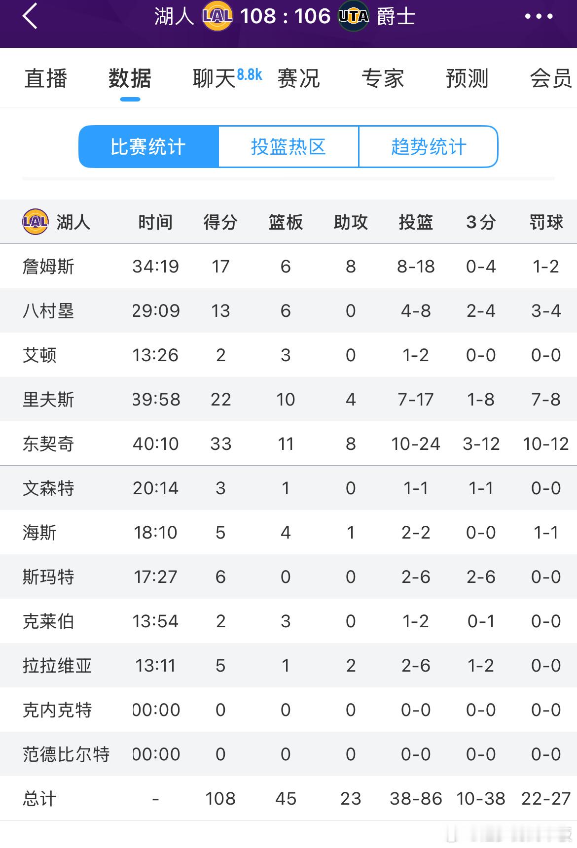赢了!湖人108-106险胜爵士🔥