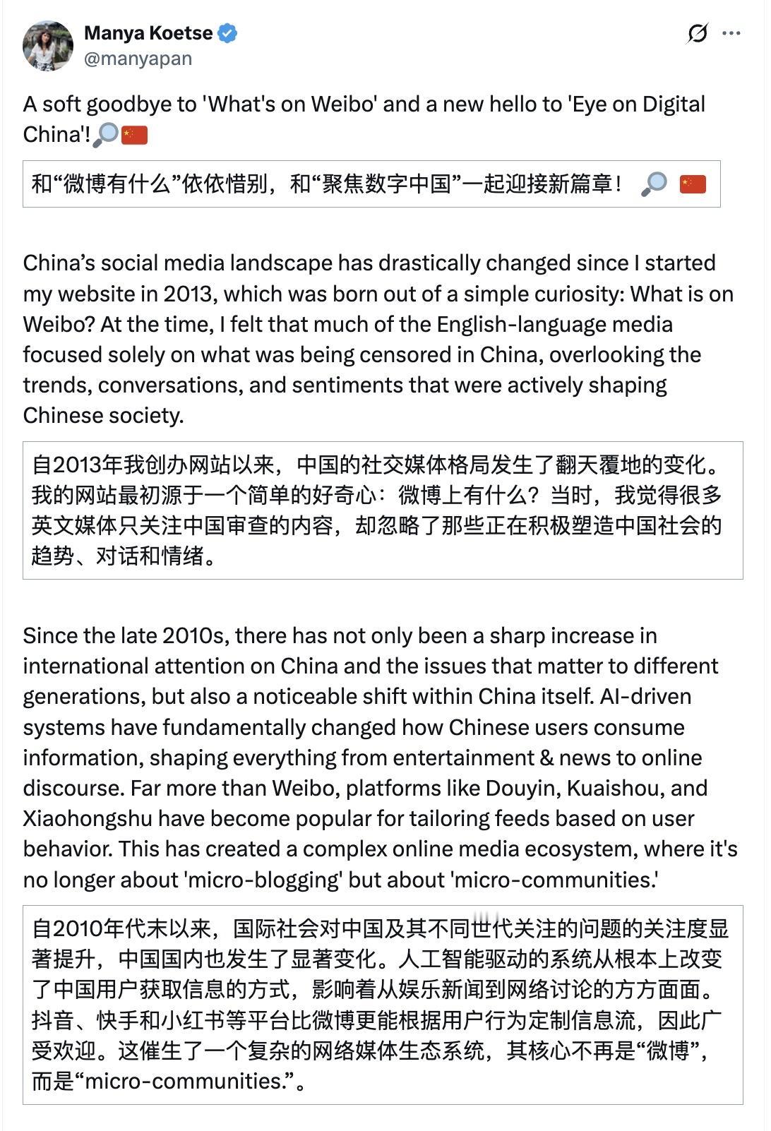 一位立场对华友好的荷兰民间汉学家 Manya Koetse 从 2013 年开始运营了一个名为 What’s On Weibo 的网站,专门向英语世界翻译、解释微博上的热点话题。这个网站长期被视为外国人了解中国网络舆论的窗口。 但日前,她宣布:这个运营了 12 年的网站将改名为 Eye on Digital China。 她在长文中解释原因:微博已经无法代表中国主流社交媒体的舆论风向。和抖音、快手、小红书等平台相比,微博如今显得老化、边缘化,越来越不像中国互联网讨论的中心。既然微博的权重和影响力已经显著下降,再继续挂着“Weibo”这个名字,反而会误导英文读者,让他们误以为微博仍是中国舆论场的核心。 因此,网站未来将把重点放在解析抖音、快手、小红书等新平台的内容,微博将只在新网站里保留一席之地,但已不再是重点。 一个在国际上深耕 12 年的中国网络舆论的观察者,正式宣布微博不再是向外界解读中国舆论的窗口。这大概比任何国内的数据和争论,都更能说明微博的时代正在消散。