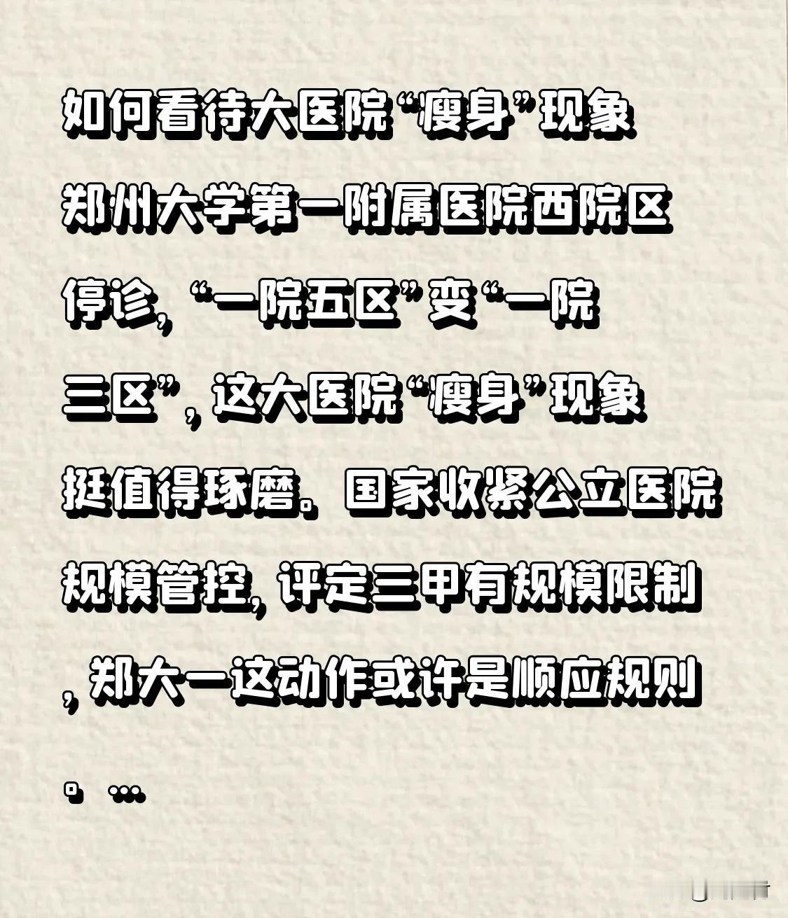 如何看待大医院“瘦身”现象 如何看待大医院“瘦身”现象 郑州大学第一附属医院西院区停诊,“一院五区”变为“一院三区”,这一大医院“瘦身”现象值得深思。 国家收紧公立医院规模管控,评定三甲有规模限制,郑大一附院此举或许是顺应规则。西院区投入5.83亿建成,开诊仅一年出头便停诊,着实可惜。但从长远看,这意味着告别“比床位”“扩院区”的粗放扩张时代。 分拆后总床位或从1.3万张减至7500张左右,大医院可更专注于疑难重症诊疗,独立专科医院也有机会成为“单科冠军”。这一“瘦身”虽有阵痛,却是医疗产业优化升级的信号。