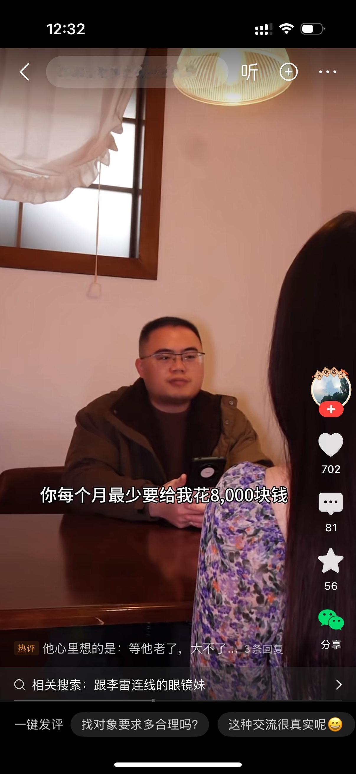 男子和女生相亲。女子刚介绍说自己35岁。男子就打断她,说要介绍一下自己。男子说我是一个优质的大龄剩男。我一个月挣3000块,我想找一个白富美,她每个月必须给我8000块钱。因为我的前女友就是这么做的。而且我脾气不是很好,所以我想找一个情绪稳定的女朋友。不知道你是否符合条件?女生冷笑了一声,你这厚脸皮跟谁学的?男生说,你们女生啊。