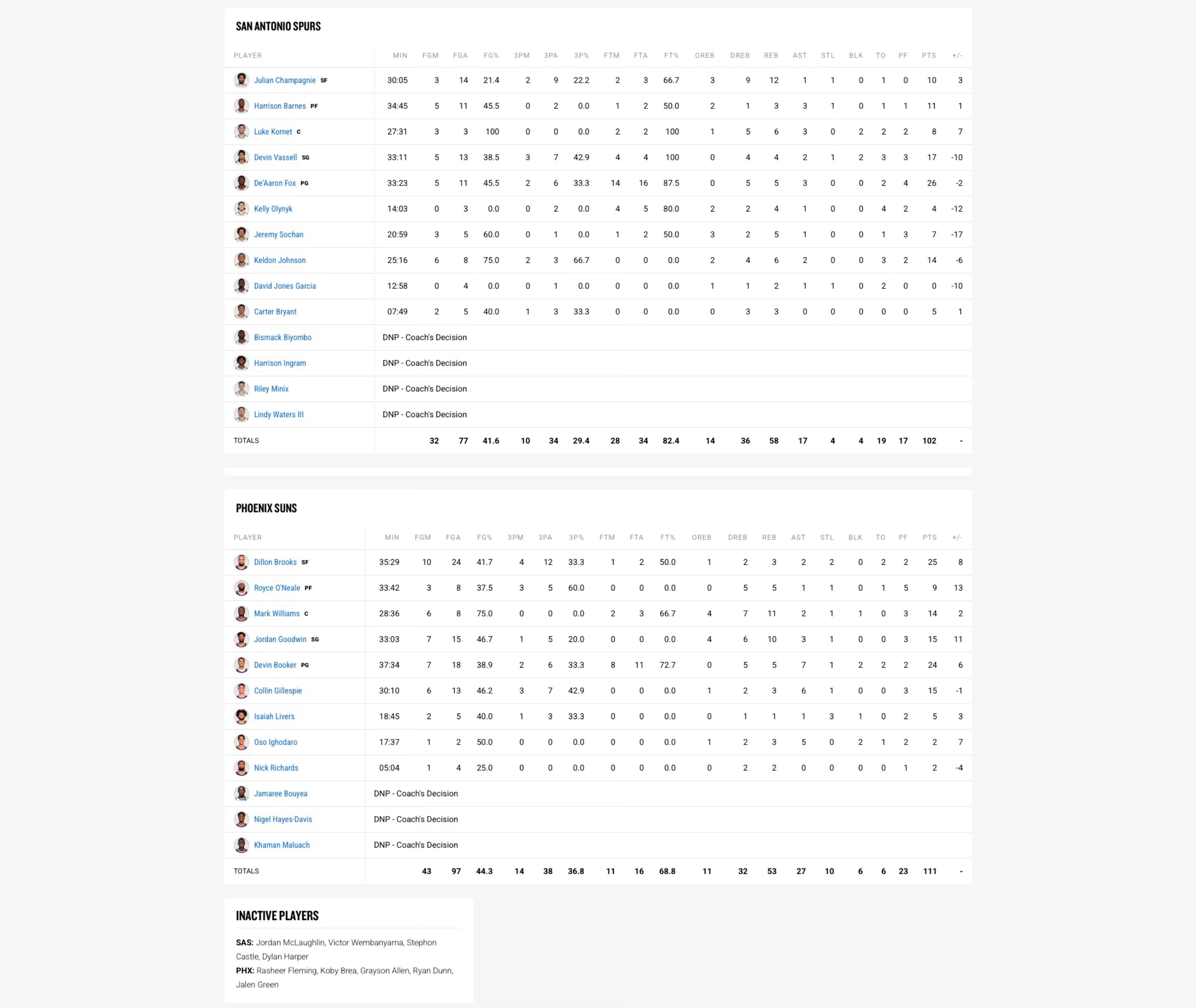 全场比赛结束!马刺客场102-111不敌太阳,结束三连胜马刺(11-5):福克斯26分5板3助、瓦塞尔17分4板2助2帽、凯尔登14分6板2助、巴恩斯11分3板3助、尚帕尼10分12板1助、科内特8分6板3助2帽、索汉7分5板1助、布莱恩特5分3板、奥利尼克4分4板1助、加西亚2板1助太阳(11-6):狄龙25分3板2助2断、布克24分5板7助2帽、古德温15分10板3助、吉莱斯皮15分3板6助、威廉姆斯14分11板2助、奥尼尔9分5板1助、利弗斯5分1板1助3断、伊戈达罗2分3板5助2帽、理查兹2分2板马刺下一场将在11月27日客场挑战开拓者 | |