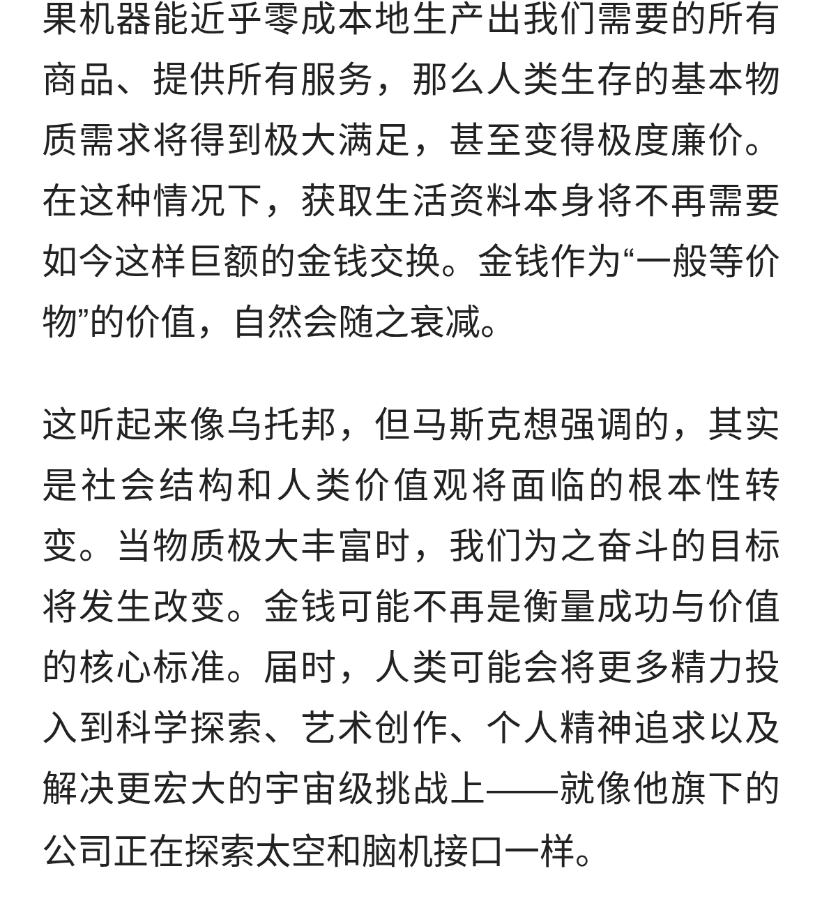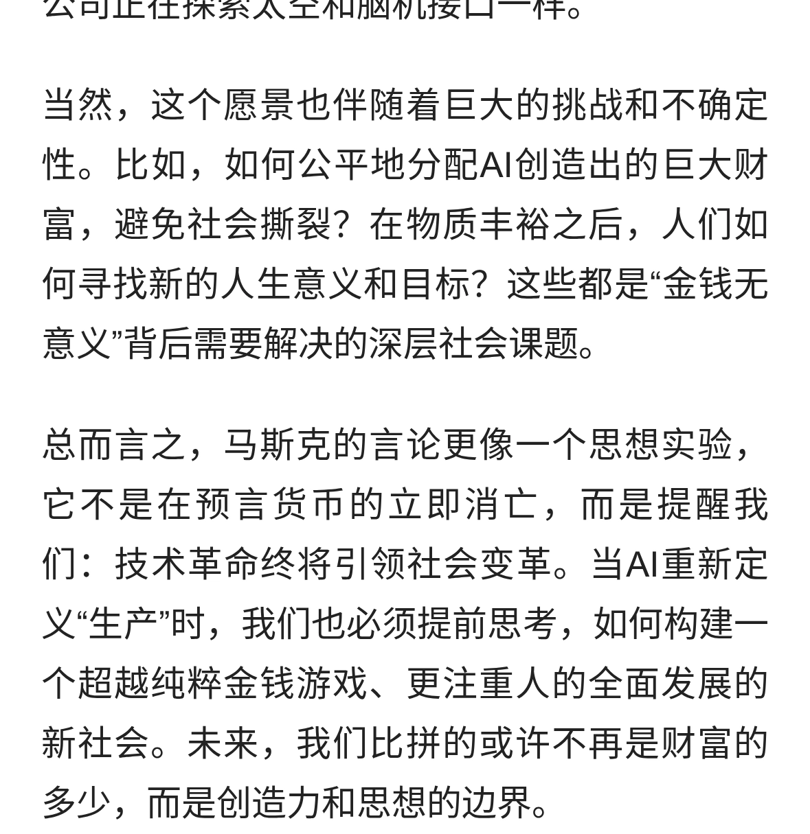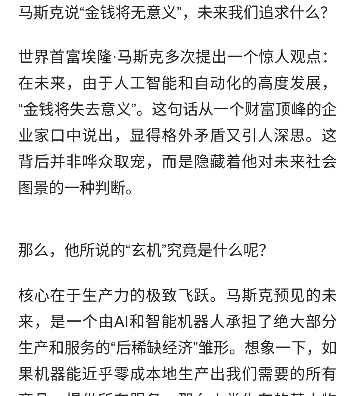 马斯克说金钱将失去意义 马斯克又语出惊人,说AI在会融入各个行业,会让...