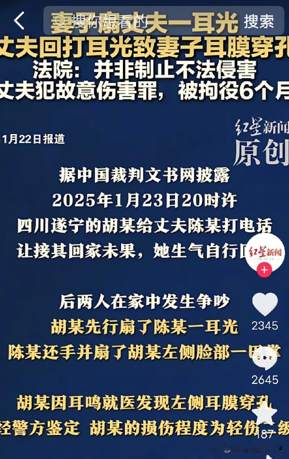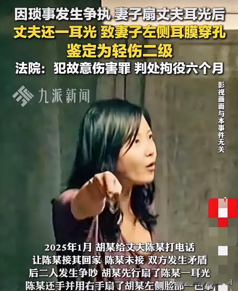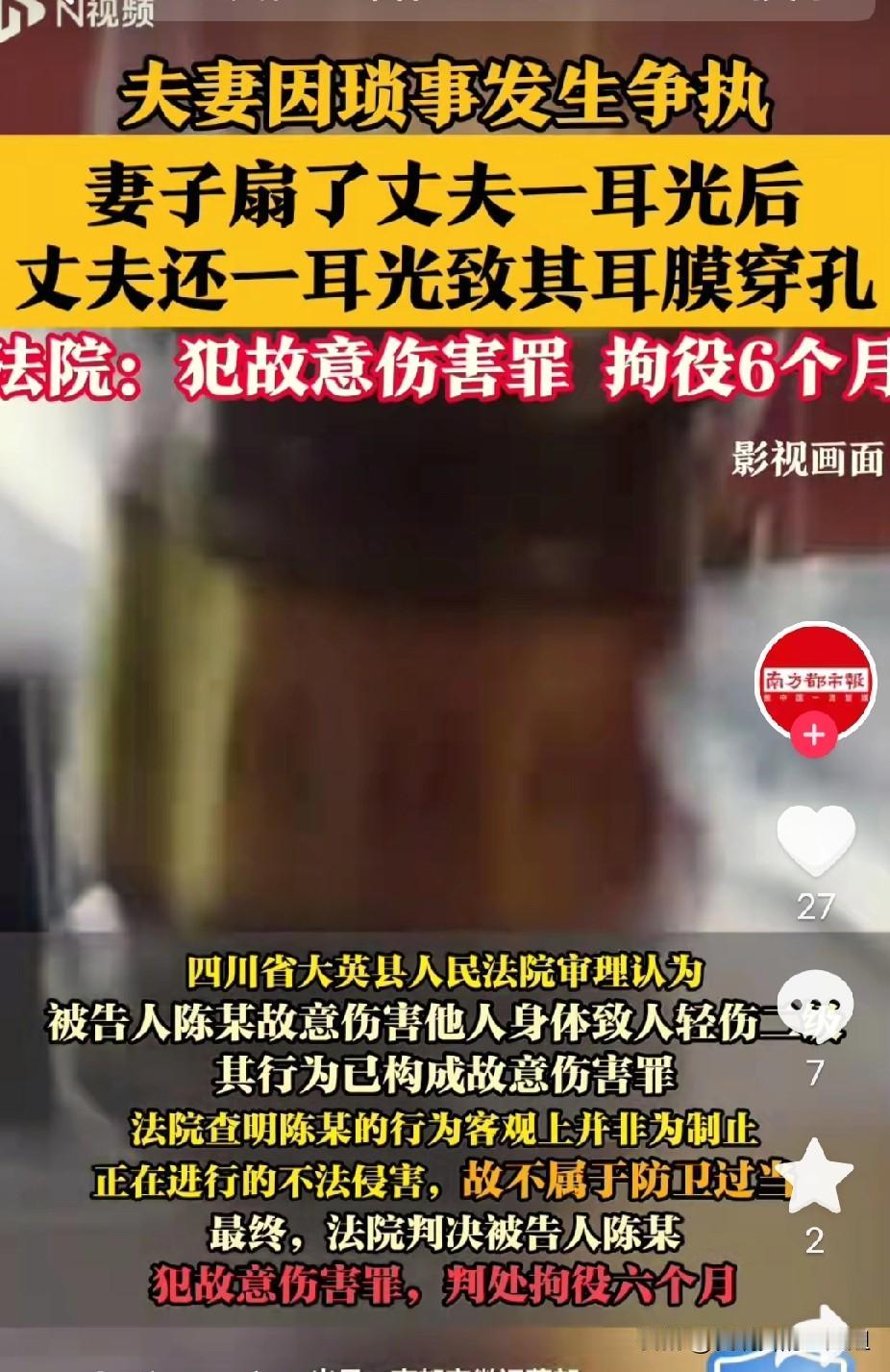 “不是正当防卫!”四川,妻子晚上在外给丈夫打电话,想让丈夫接自己回家,见丈夫不接,自行回家后,生气打了丈夫一个耳光。丈夫被打后,也来了气,反手也给了妻子一个耳光,结果悲剧了,因致妻子耳膜穿孔,构成轻伤二级,被控涉嫌故意伤害罪。丈夫一方的辩护人认为妻子先动手,丈夫的还击行为属于防卫行为,最多是防卫过当。法院这样判! 据悉,32岁男子陈某与女子胡某系夫妻关系。 2025年1月23日晚20许,胡某在外给陈某打电话,想让陈某接自己回家。 因为陈某不接,胡某便生了气,而后自己一个人独自回家。 回到家后,耿耿于怀的胡某又因陈某不接自己回家与陈某理论了起来,而后还与陈某发生了争吵。 这事儿看起来是夫妻间普通的争吵升级,一巴掌换一巴掌似乎很“公平”,但法律可不是这么算的。法院判决点明了一个关键:正当防卫的核心是为了制止不法侵害,而不是出于愤怒的“对等报复”。陈某在挨打后,面临的侵害已经随着那一巴掌结束而停止了,他完全可以选择报警、躲避或者用更温和的方式控制住妻子,而不是用暴力还击。这种“你打我一下,我必须还你一下”的思维,恰恰是很多家庭纠纷演变成刑事案件的导火索 。 法律上认定正当防卫有严格的标准,尤其是要求不法侵害“正在进行”。打个比方,如果有人持刀冲过来,你夺刀自卫那是防卫;但如果对方打了一拳后就站着不动了,你再冲上去打回去,这就成了新的侵害行为。陈某的还手耳光,发生在妻子胡某的侵害行为之后,并非为了制止一个持续的暴力行为,所以法院认定这不属于防卫行为 。 换个角度想,如果“先动手”就能成为对方无限度还击的通行证,那家庭冲突只会愈演愈烈。真正的自我保护,应该是及时脱离冲突现场并寻求法律帮助,而不是在情绪驱动下以暴制暴。陈某这一巴掌付出的代价是拘役六个月,这个教训足够深刻,它提醒所有人,在家庭矛盾中试图用暴力解决问题,最终很可能两败俱伤 。 各位读者你们怎么看?欢迎在评论区讨论。