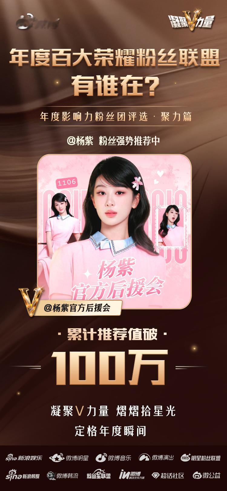 微博年度影响力粉丝团评选 📜【年度百大荣耀粉丝联盟・累计推荐值突破 100 万战报】💜热烈祝贺 累计推荐值突破 1000000+ 🔥微光成炬,共书荣章~推荐活动正在进行中…👉点击🔗【】参与推荐,与 一起点亮更多璀璨时刻🌟